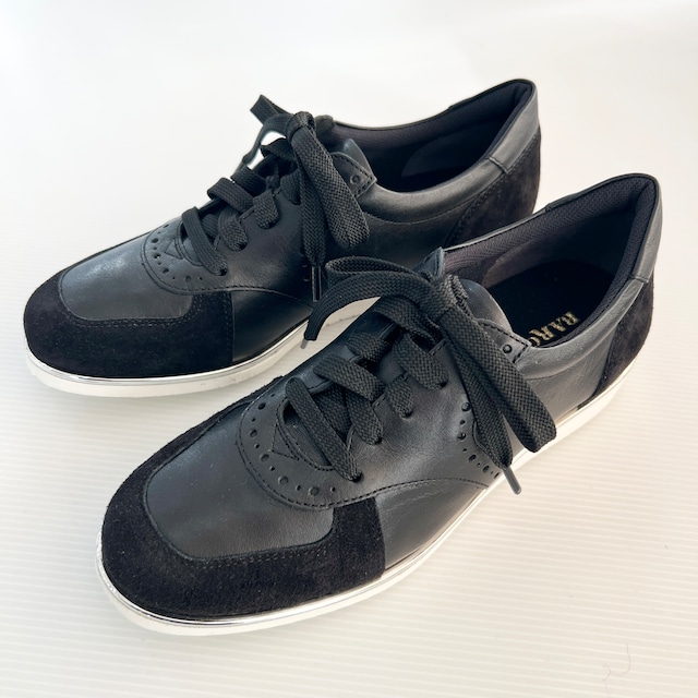 軽量スニーカー アイボリー《 BARCLAY バークレー》 ・BARCLAYがスニーカーを作ったら。試行錯誤の末に 自信を持ってオススメできる一足が完成しました。 ・トラッドな要素も忘れずに スッキリとした大人のレザースニーカーに落とし込みました。 ・クッション性の高いカップインソールを採用し 靴本体にも要所にスポンジを内蔵。 ・つま先裏にも機能性の高いメッシュ生地を使用して スニーカーらしい快適さにこだわっています。 ・目を惹くのはシルバーのピース。 ・スタック風のプリントを施したソールはとにかく軽くてクッション性も抜群です。 〔素材〕表(牛革×豚革) 裏(合成皮革(抗菌・防臭)/生地(消臭・吸汗速乾)) 中敷(素材生地(カップインソール)) ソール素材(EVA) 〔カラー〕ブラック 〔サイズ〕22.5/23.5 (㎝) 〔靴幅〕2E 〔ヒール〕フラットヒール - BARCLAY - こだわりは「ニッポン発 知的上質感」。 凛としたトラディショナルスタイルをベースに コテンポラリーなトレンドを程よくミックス 上質素材を活かしたデザインが足もとを美しく飾ります。 自社ファクトリーで100年近く続いた靴づくり。 「ファッション×ファンクション(機能性)」をキーワードに ニッポン女性の足を知り尽くした手練れの職人が 一足一足大切にお作りしています。 Made in Kobe,Nipponnの快適な履き心地をお愉しみください。 Casablancaは BARCLAY 正規取扱店です。 *ご購入前に* ABOUT(ショップ情報)をご一読頂きますようお願いいたします。 https://casablancamt.base.shop/about