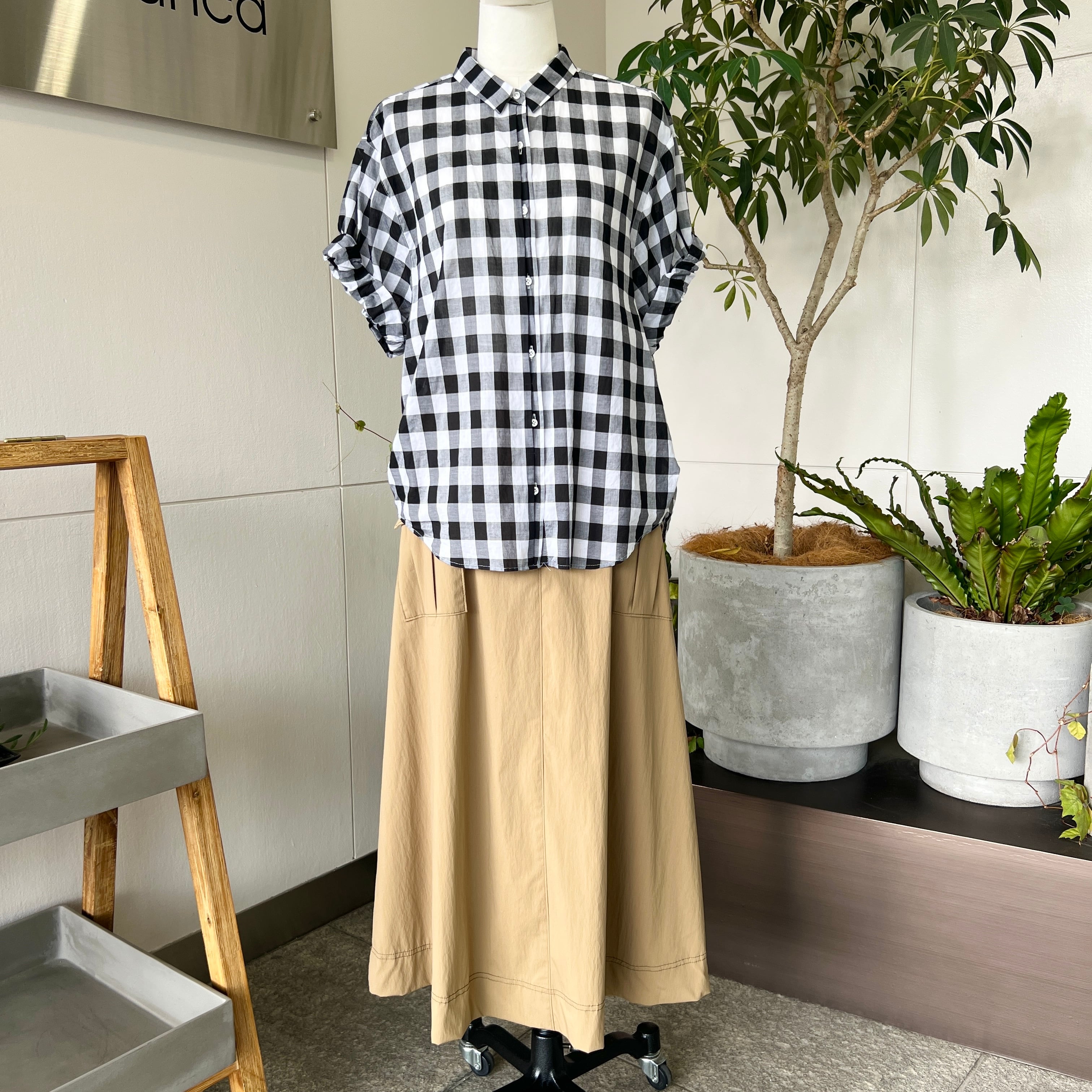 ・チビ襟・センターのボタンサイドのタック・裾サイドのタックなどお洒落なデザインです。
