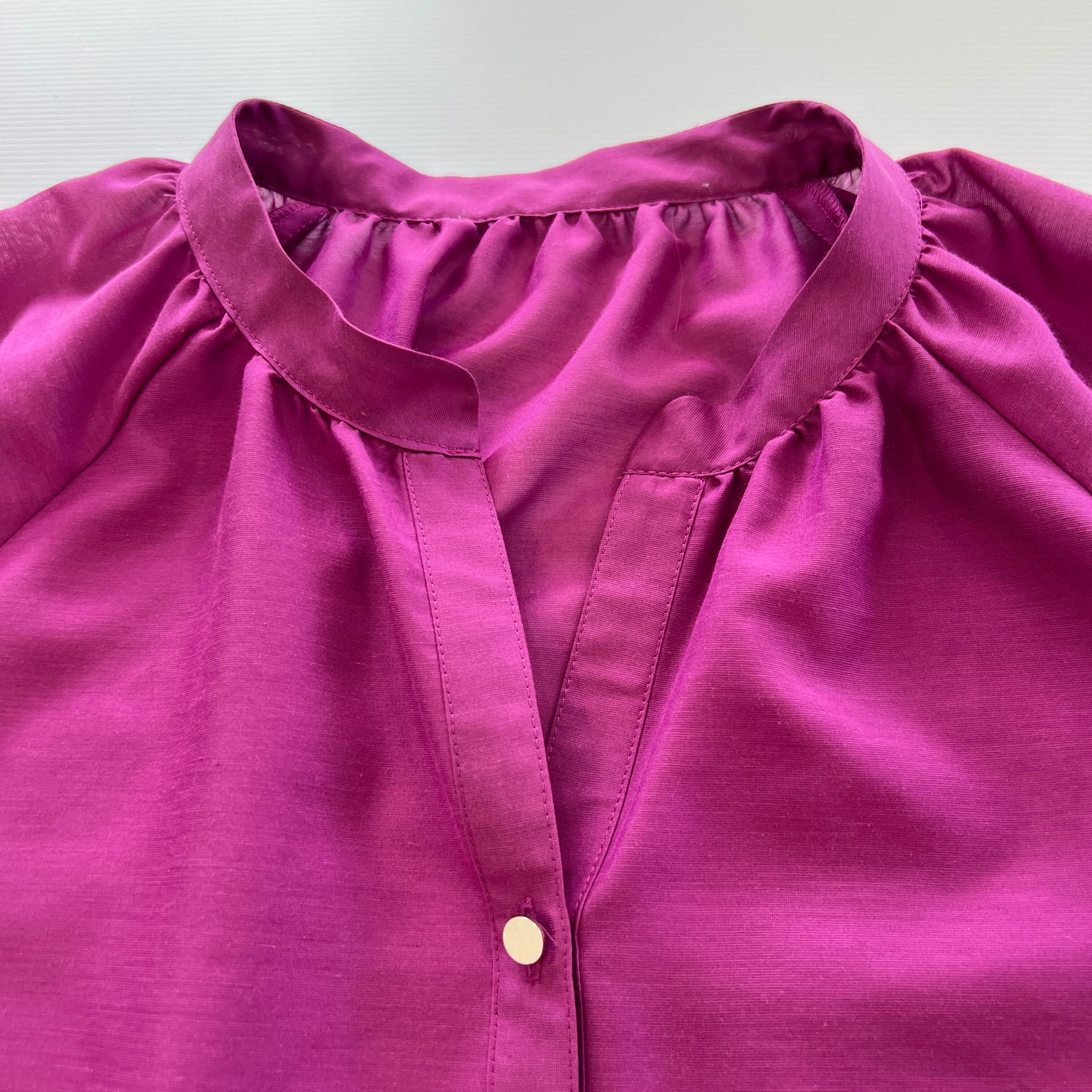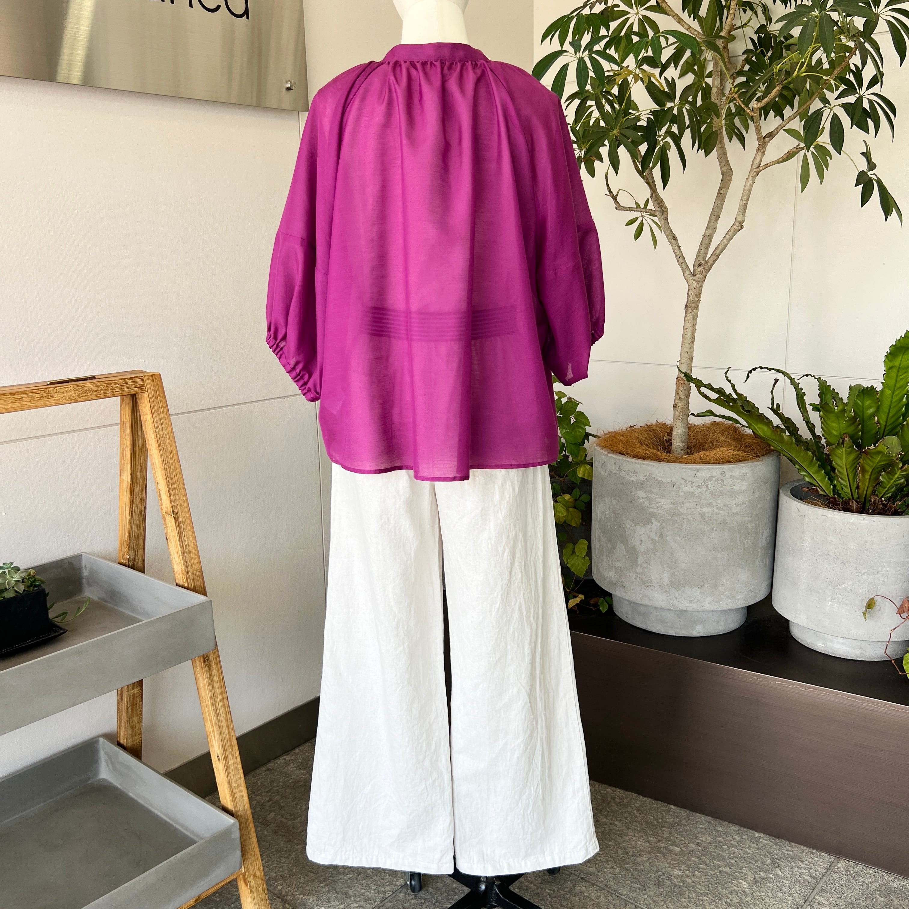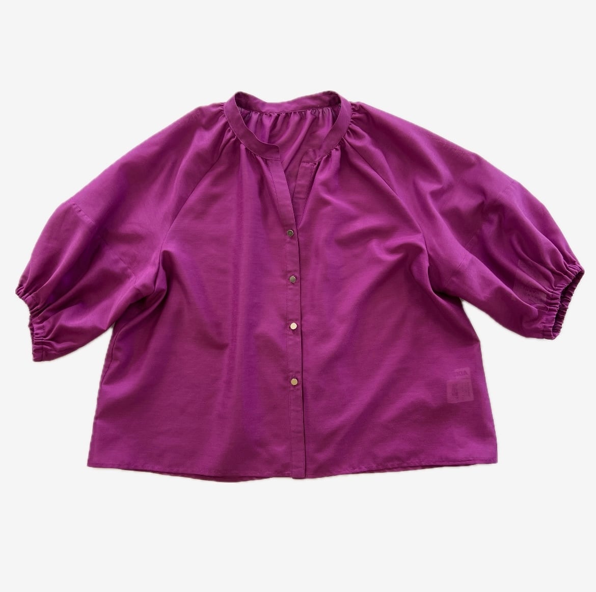 ・スッキッパーカラーのギャザーをよせたネックライン・ボリュームスリーブ・金ボタンなどさりげなくお洒落です!