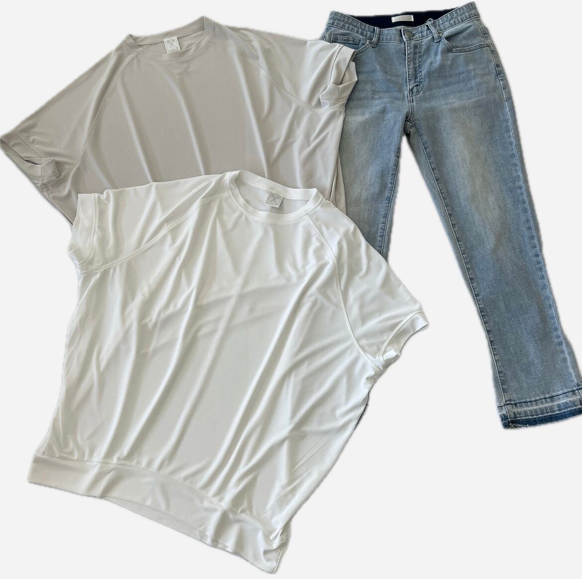 ・ブラウスライクな落ちる素材が上品見えするTシャツです。