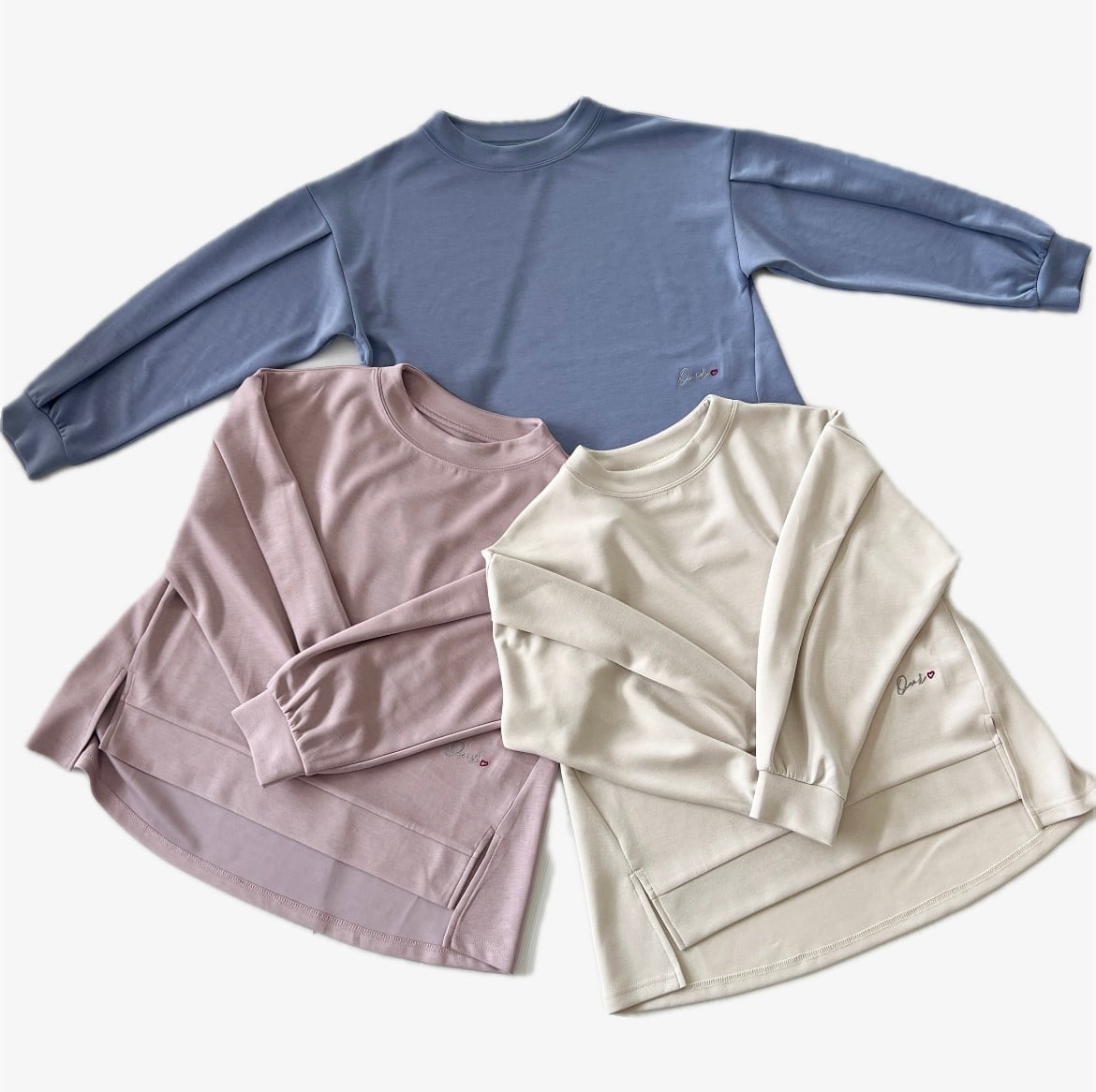 ・肩がおちるデザイン・タックスリーブ・左脇のロゴ刺繍・サイドスリットがお洒落です。