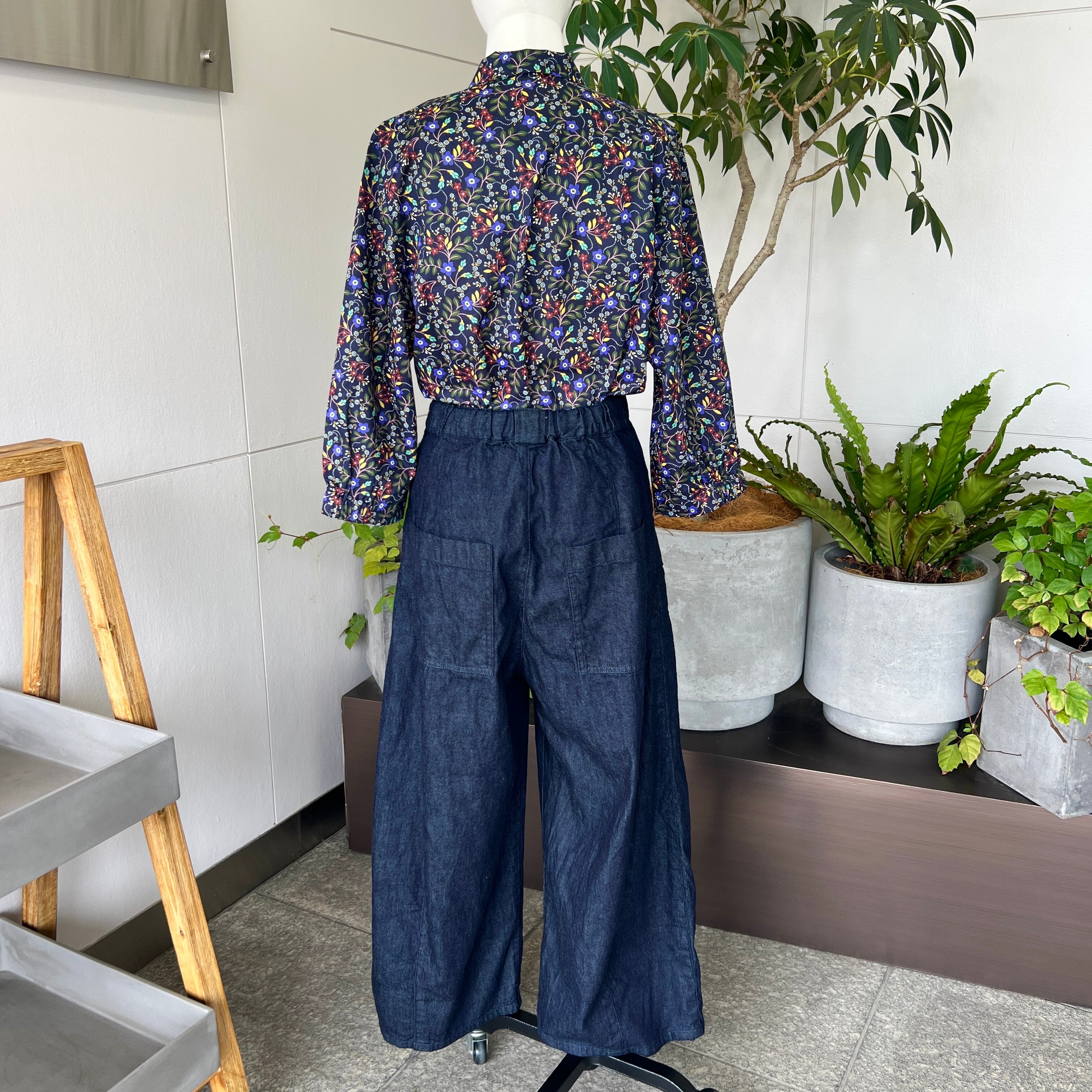 ・インディゴデニムのキュッとしまったウェストラインから裾にかけて立体的なパターンになっているチューリップパンツです。