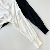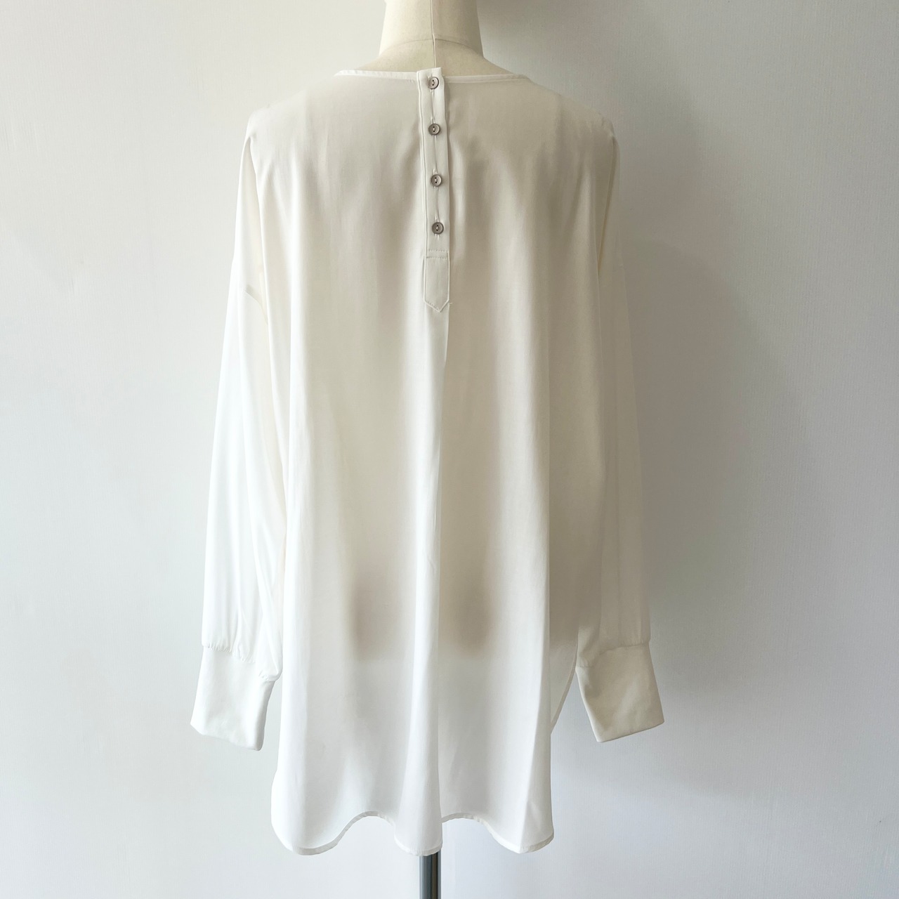 ・金属のバックボタン・ドロップショルダー・袖口リブなどさりげなくお洒落なデザインです。