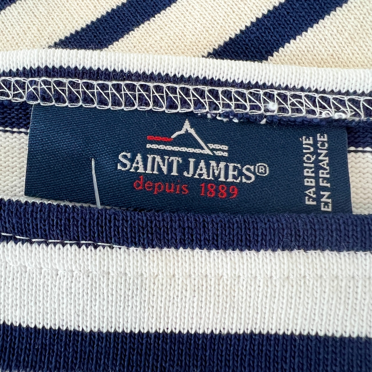 SAINTJAMESは130年以上の歴史のあるブランドです。ブランドロゴは「Né de la mer」フランス語で セントジェームスの製品が自然と共存するノルマンディーの「海の暮らしから生まれた」ということを表しています。セントジェームスのブルーはノルマンディーの海の色、そしてロゴマークにはこの地の歴史的遺産であるモン・サンミッシェルがデザインされています。