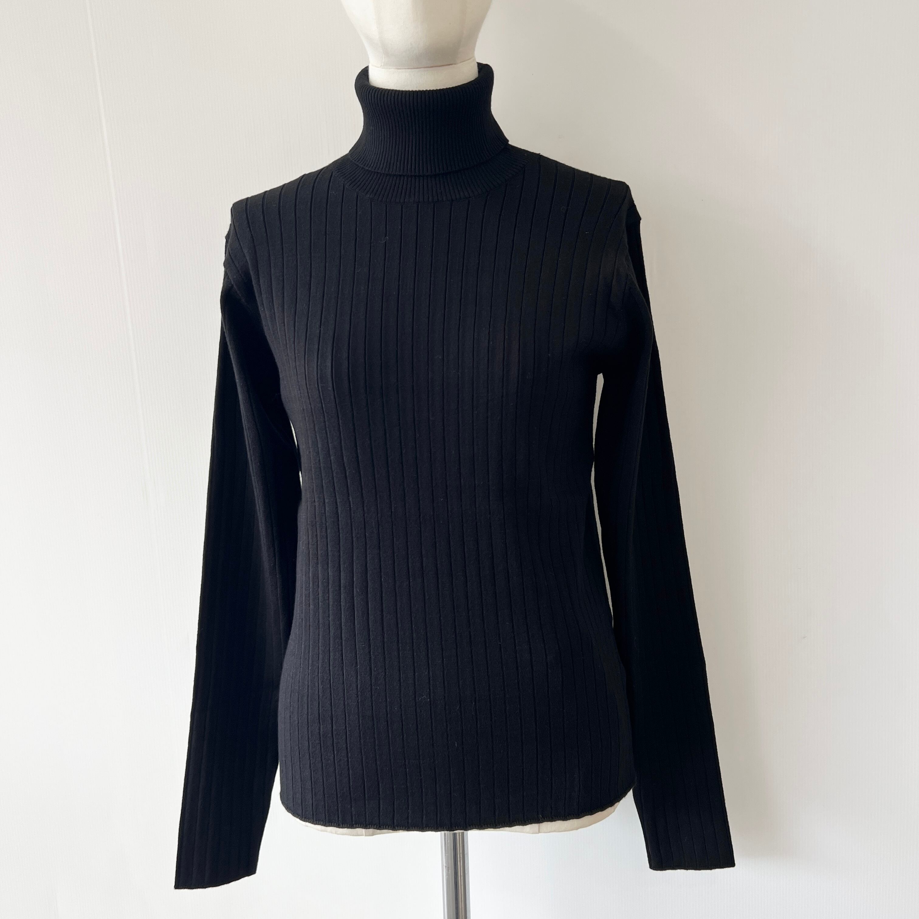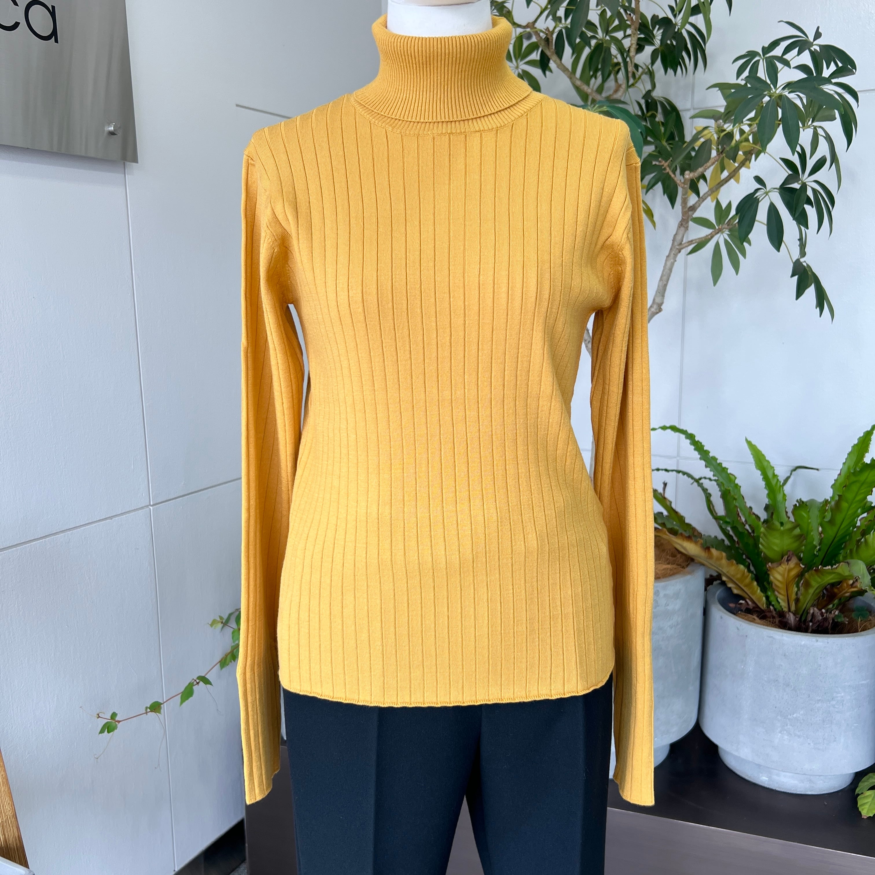 ・リブが縦のラインを強調しすっきりとした印象のタートルネックニットです。