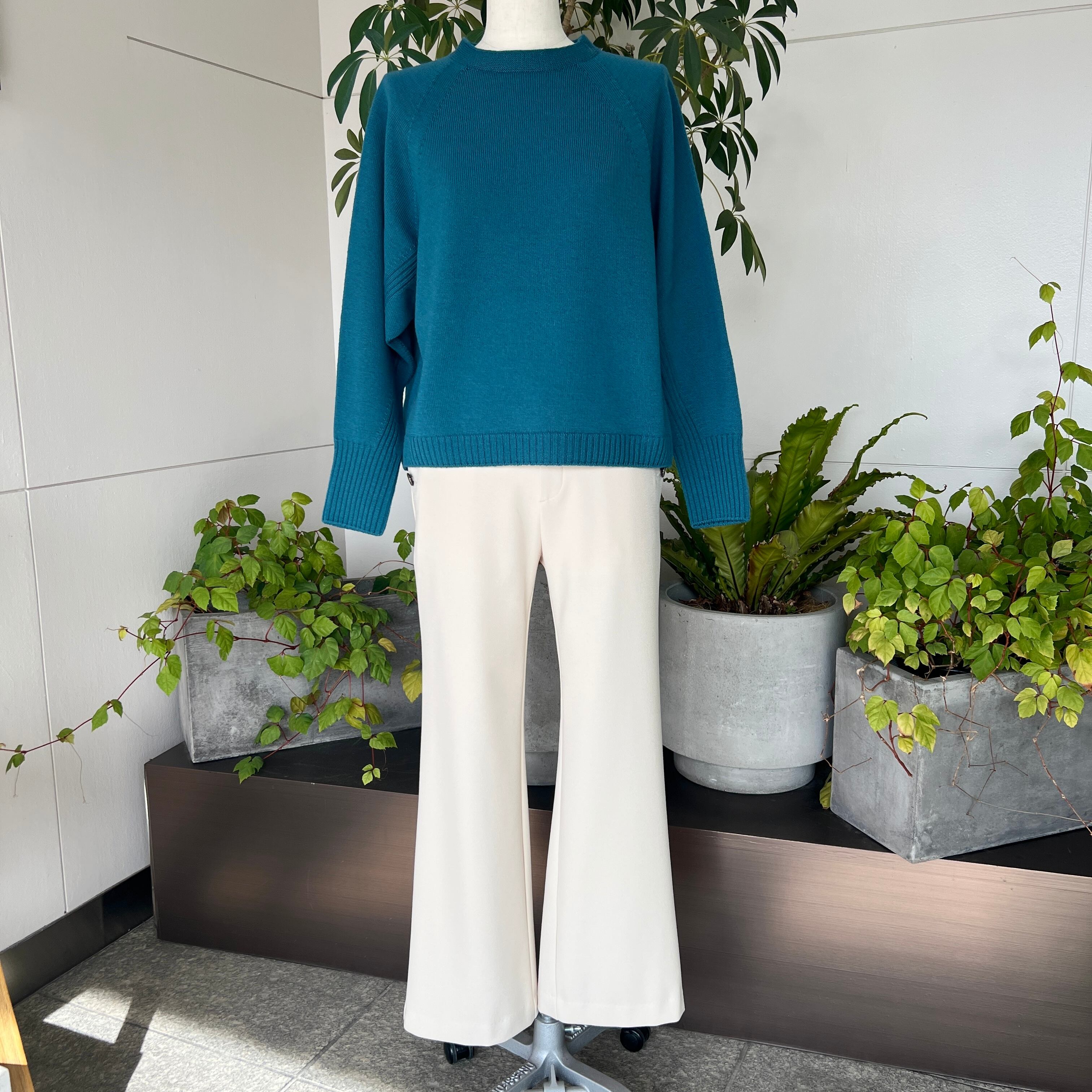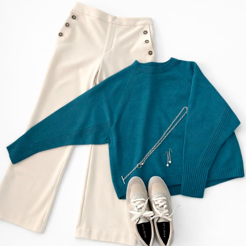 ・そのまま1枚で着る他にもシャツなどの上に重ね着しやすいラグラン袖 身頃は自然な前後差があり どんなボトムでも合わせやすいのが特徴のデイリーに着ていただけるセーターです。