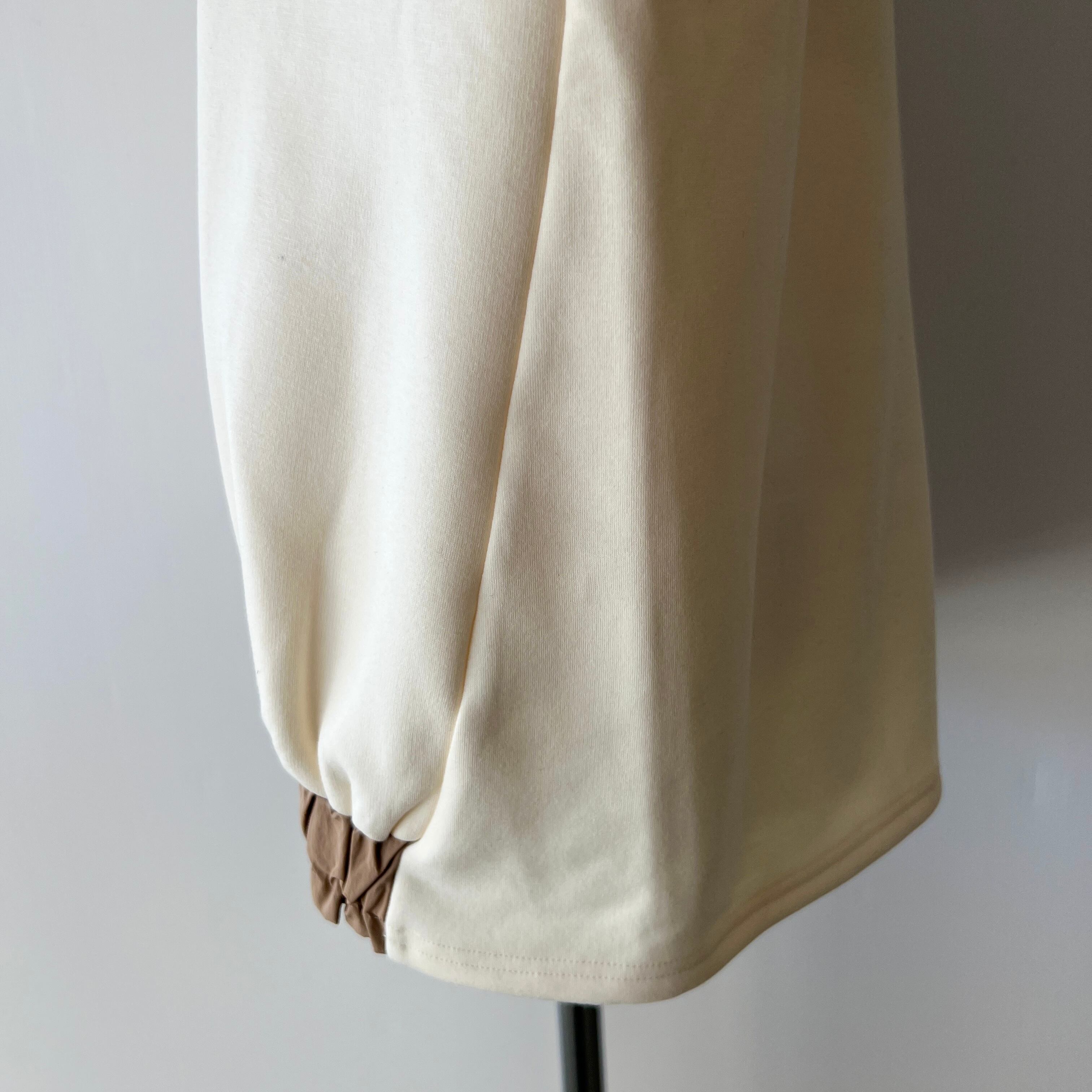 ・袖口と裾のゴム入りのタフタ素材の切替とロゴがポイントです。