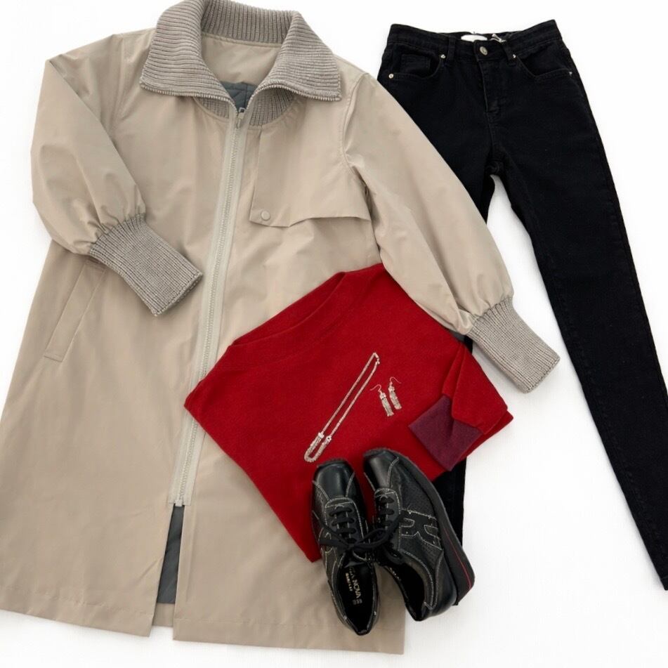 ・襟元とお袖のロングリブニットがアクセントになり 大き目ファスナーがお洒落でポイントです。