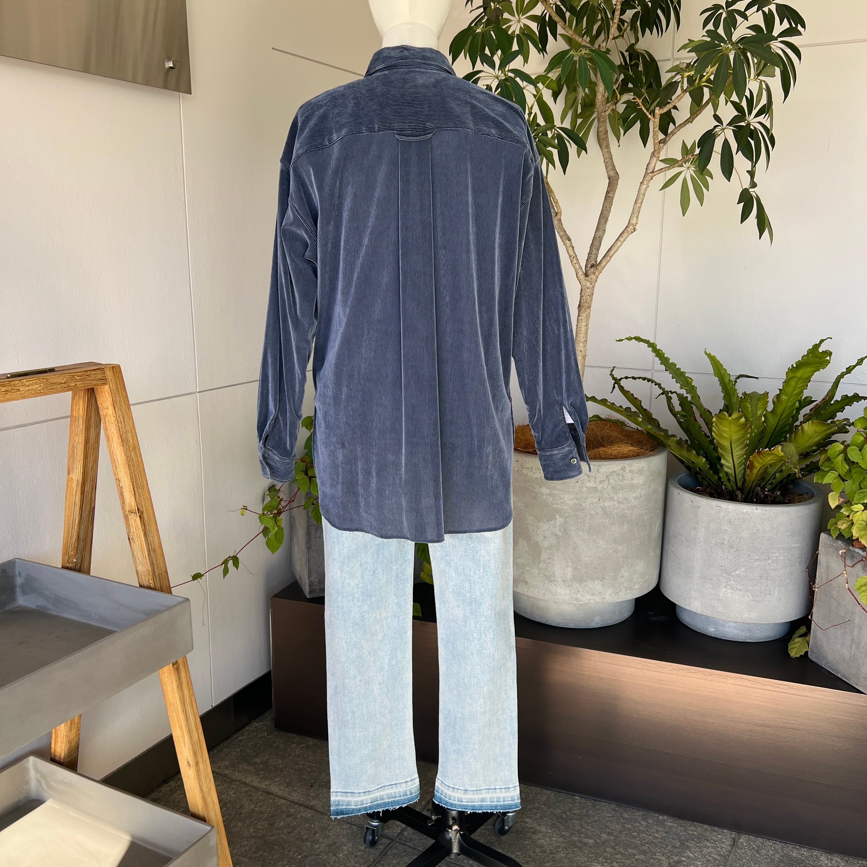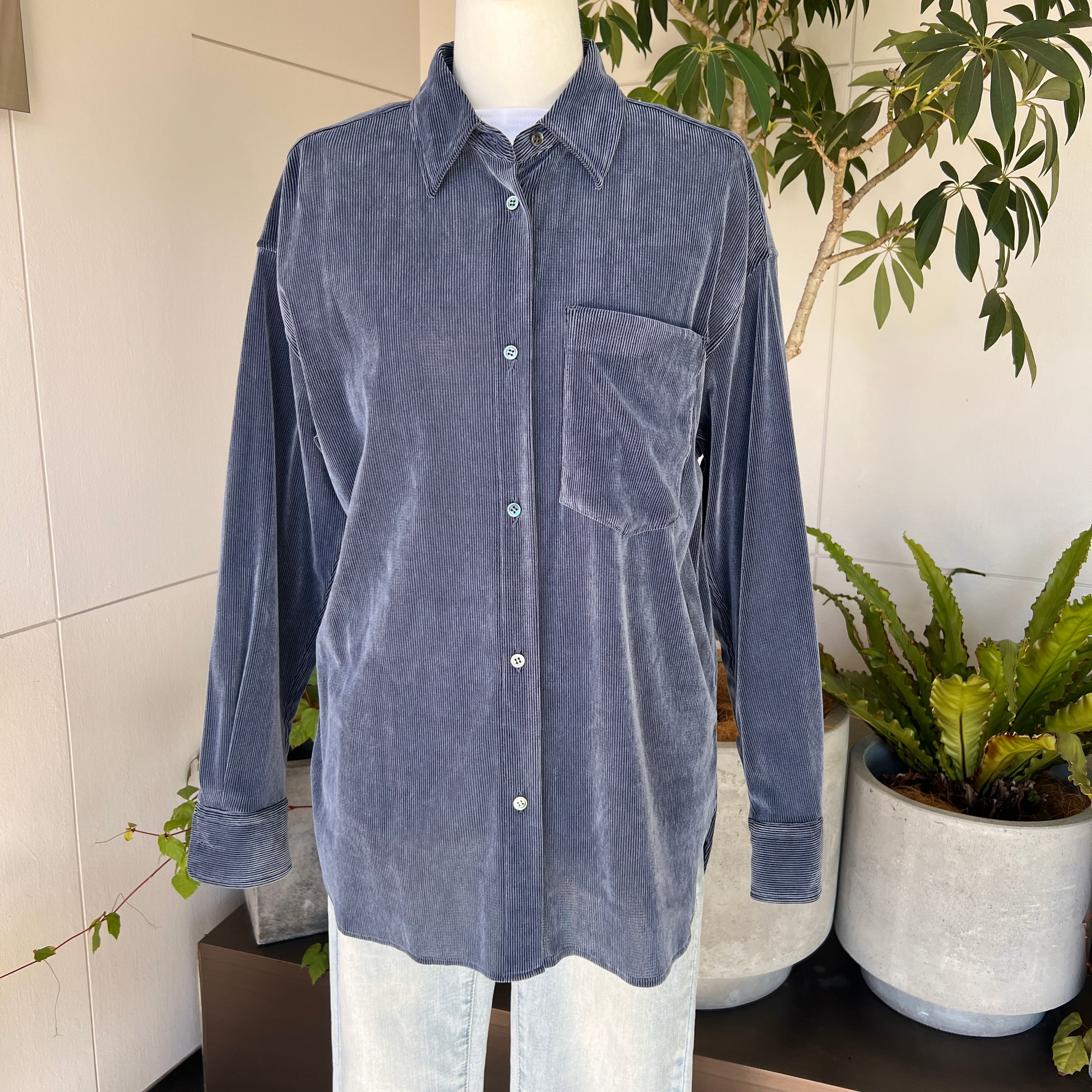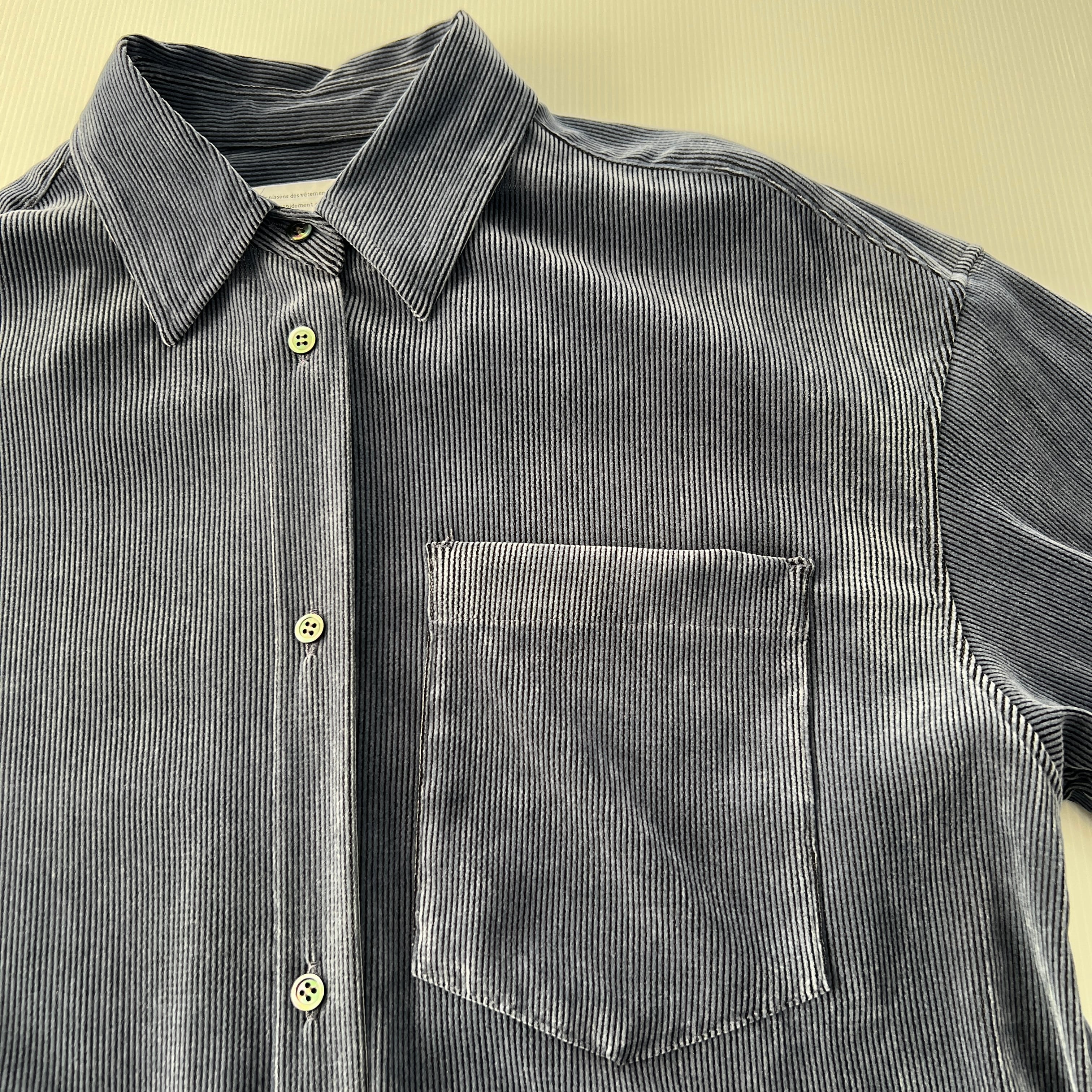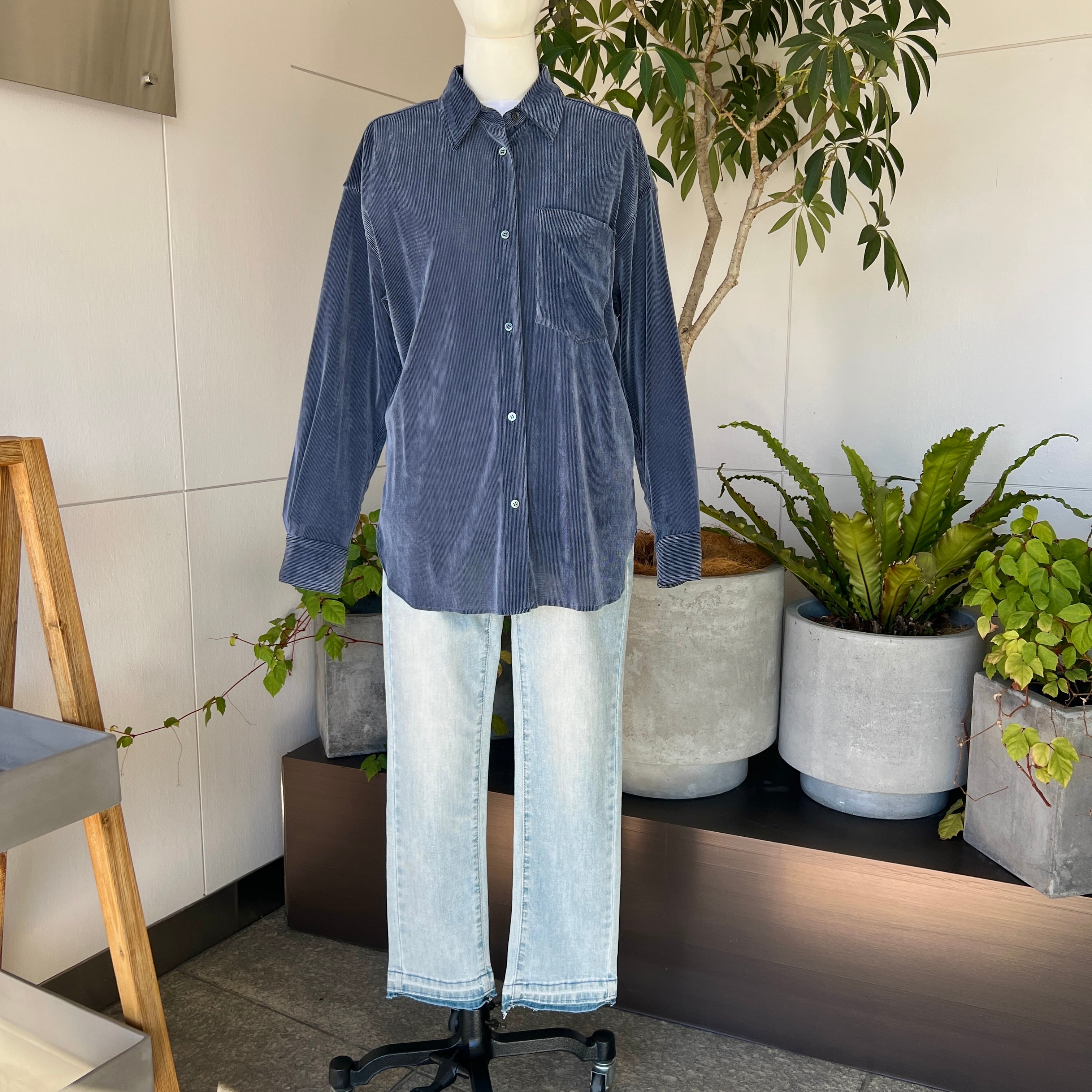 ・細畝のコーデュロイ風のストレッチ素材のフロッキーが上品な表情を演出するブラウスです。