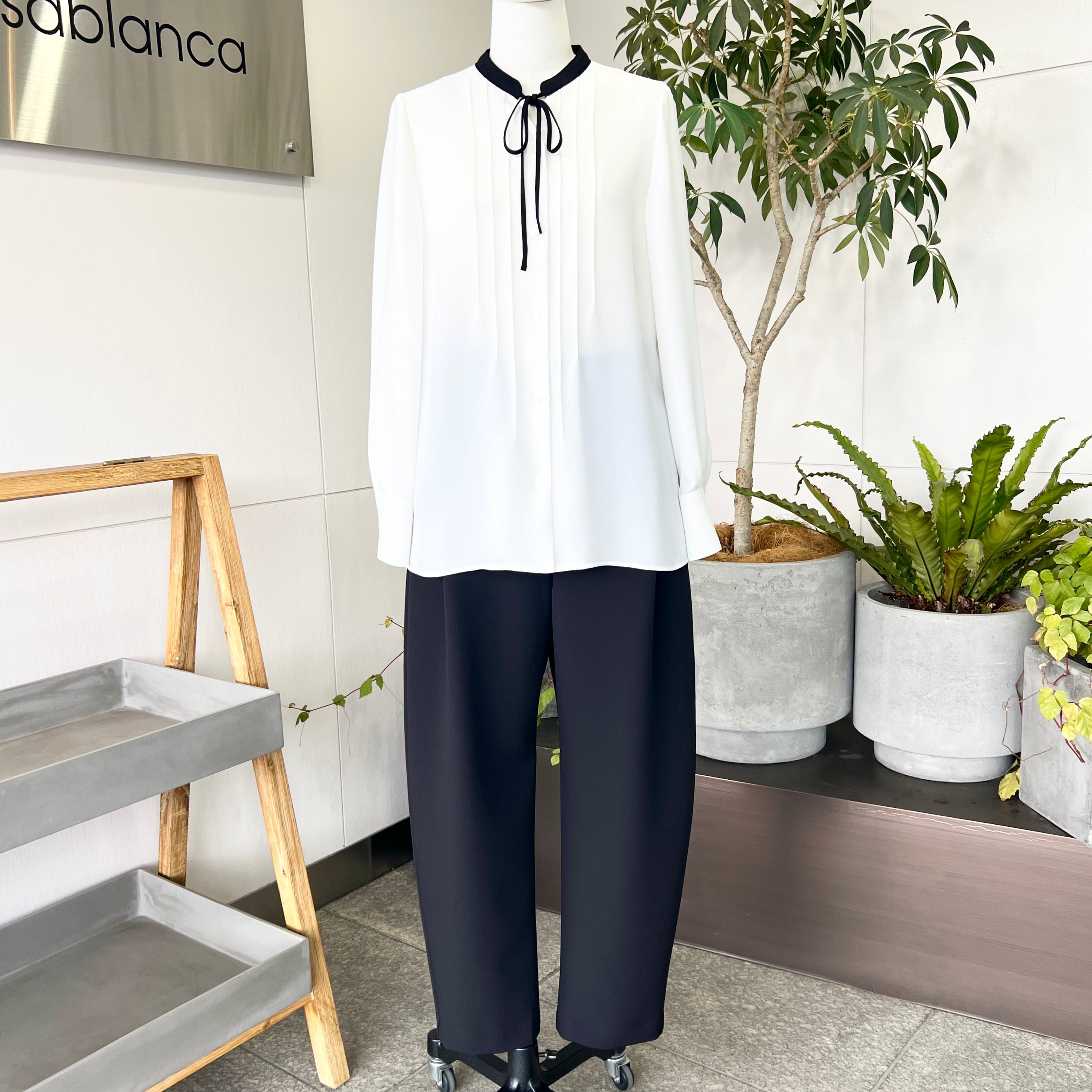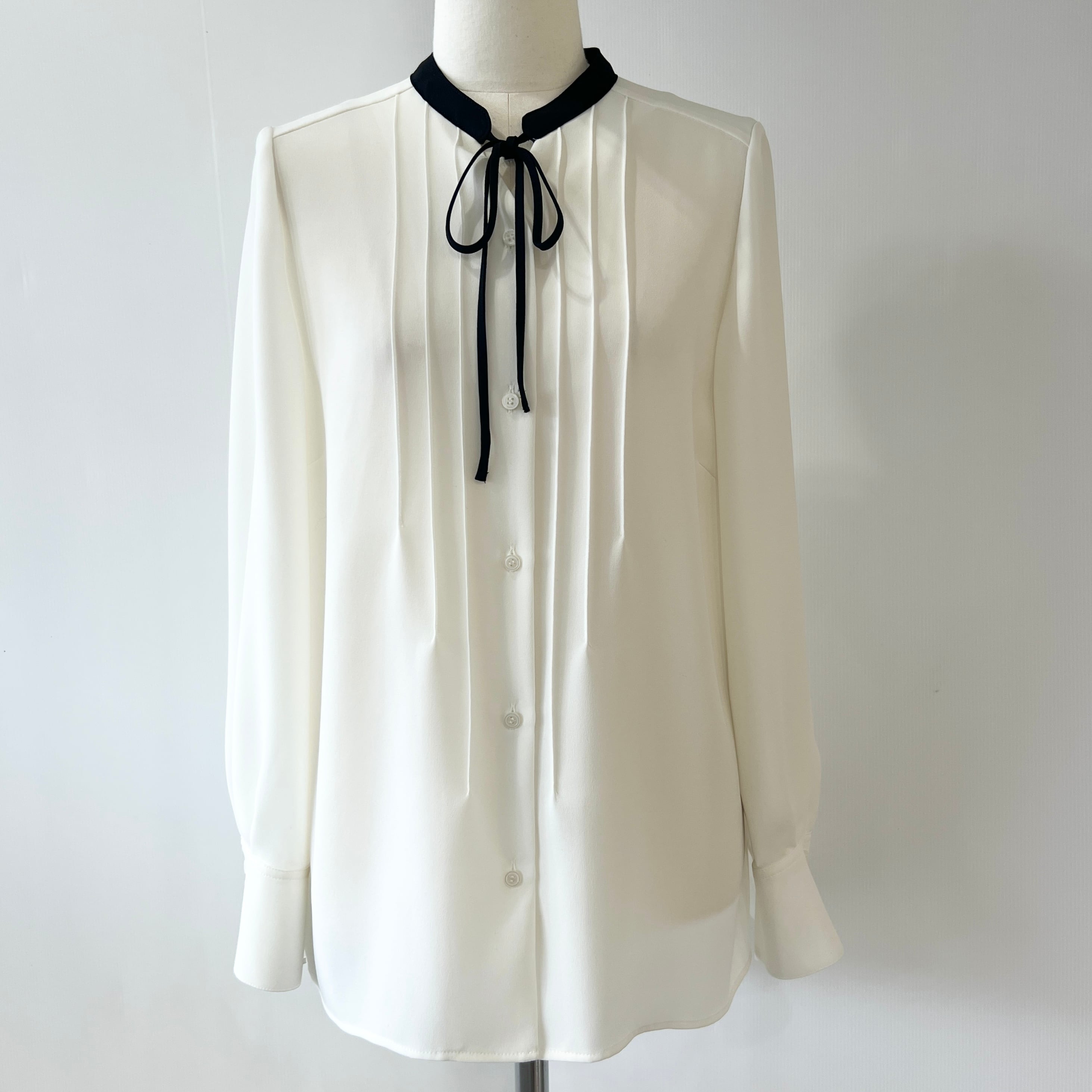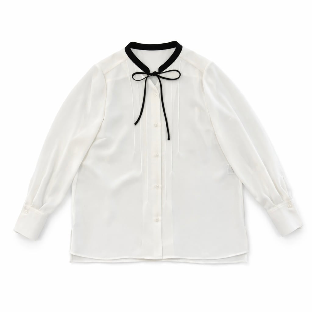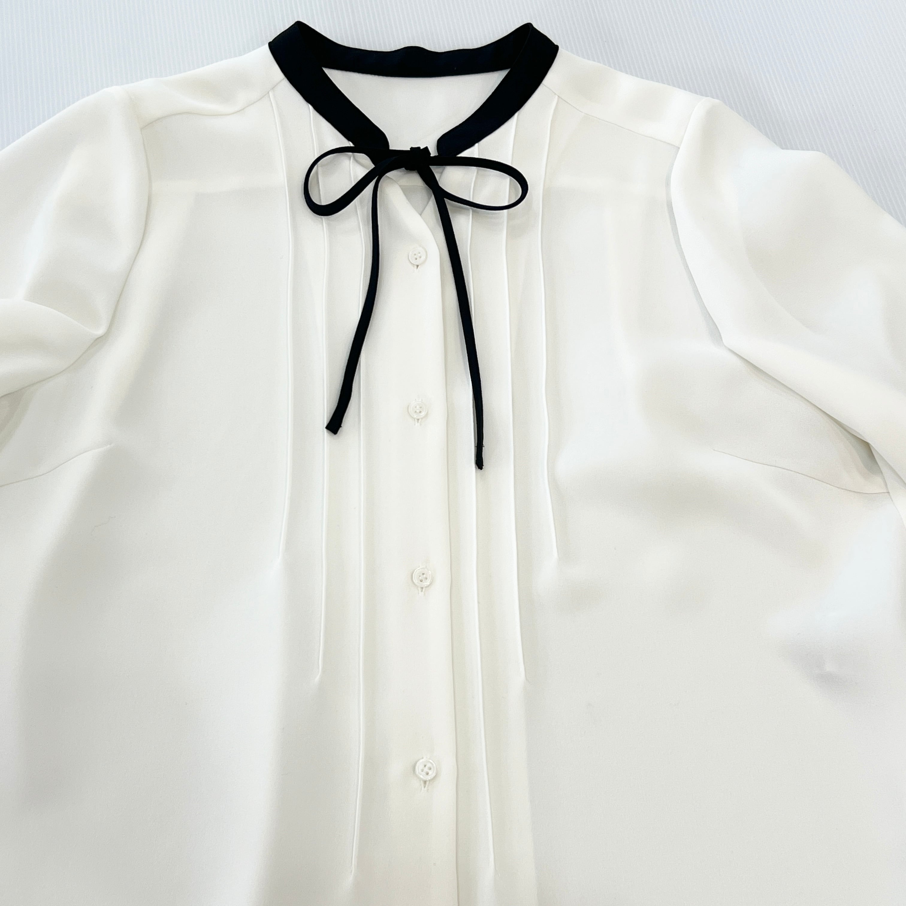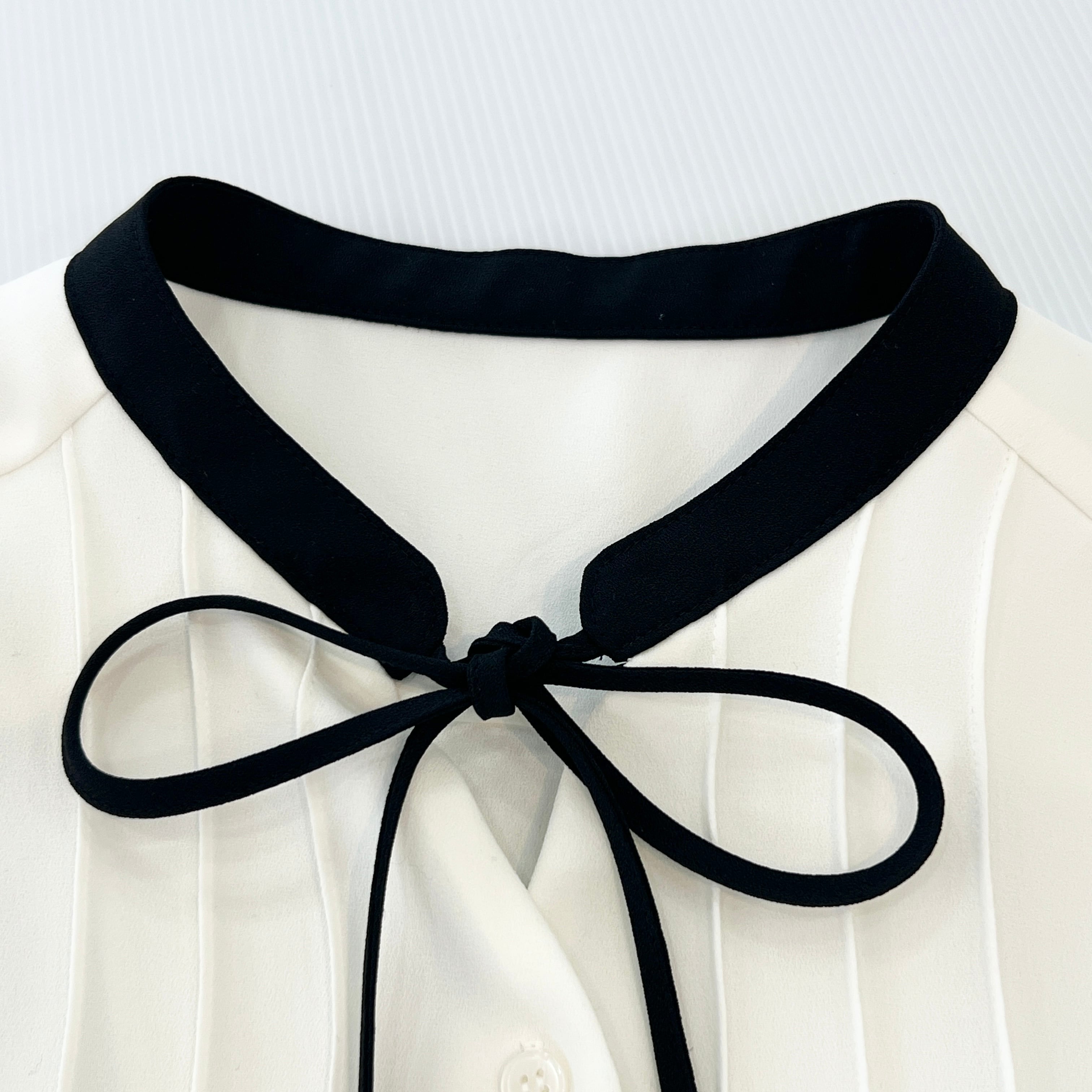 ・フロントタックと配色と華奢なナローボウタイがお洒落なブラウスです。