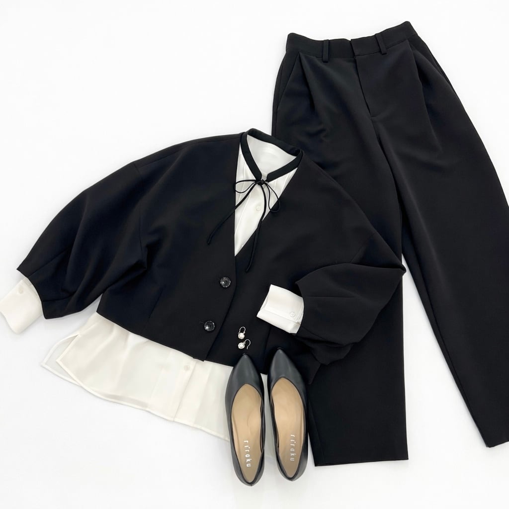 ・縦ラインのフロントタックと配色のナローボウタイがポイントです!