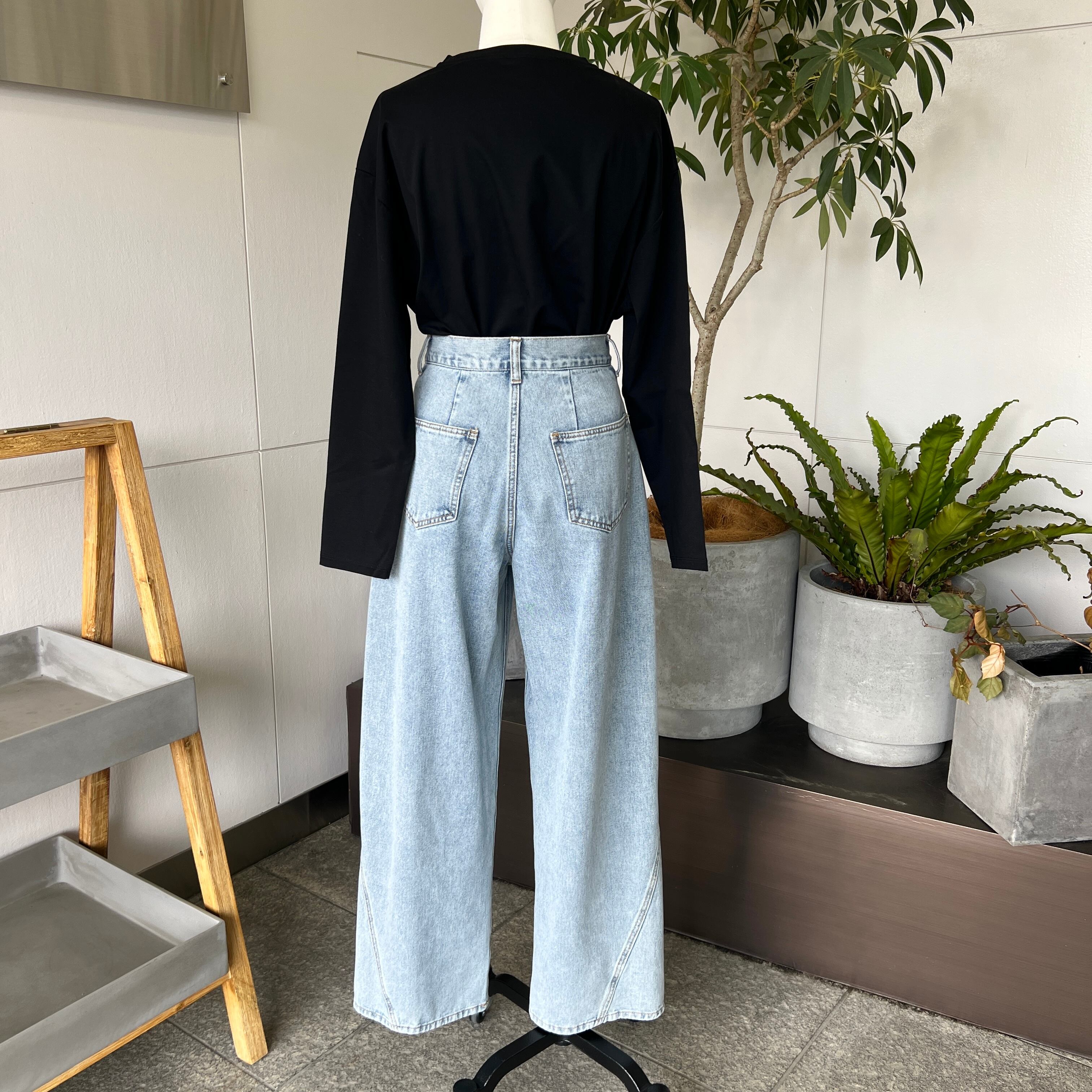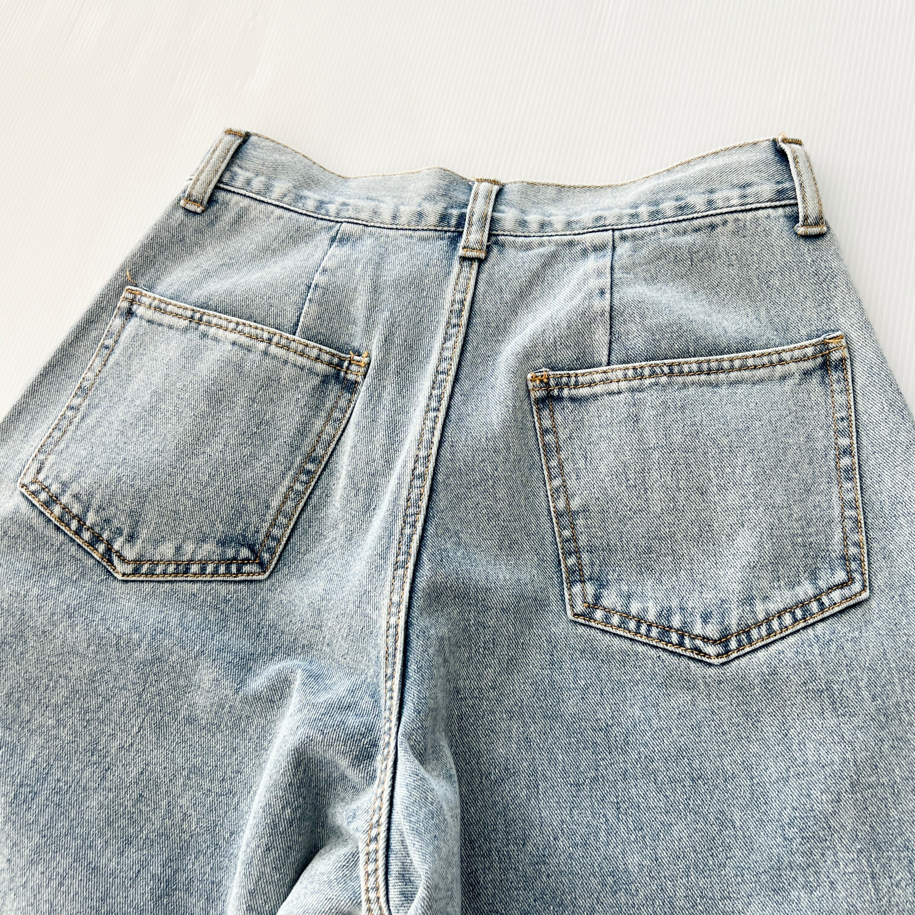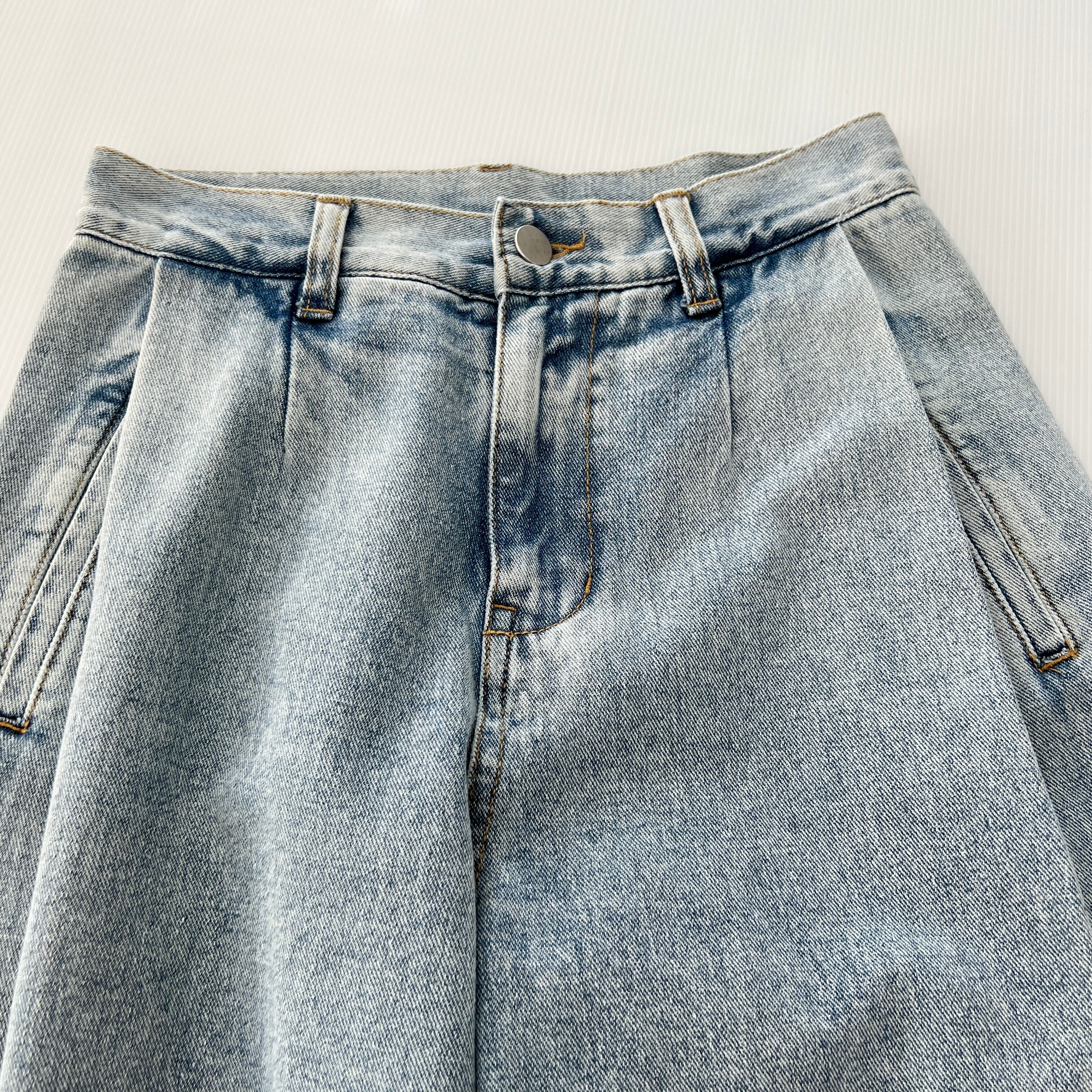 ・サイドタックがポイントのハイウエストのデニム バレルレッグパンツです。