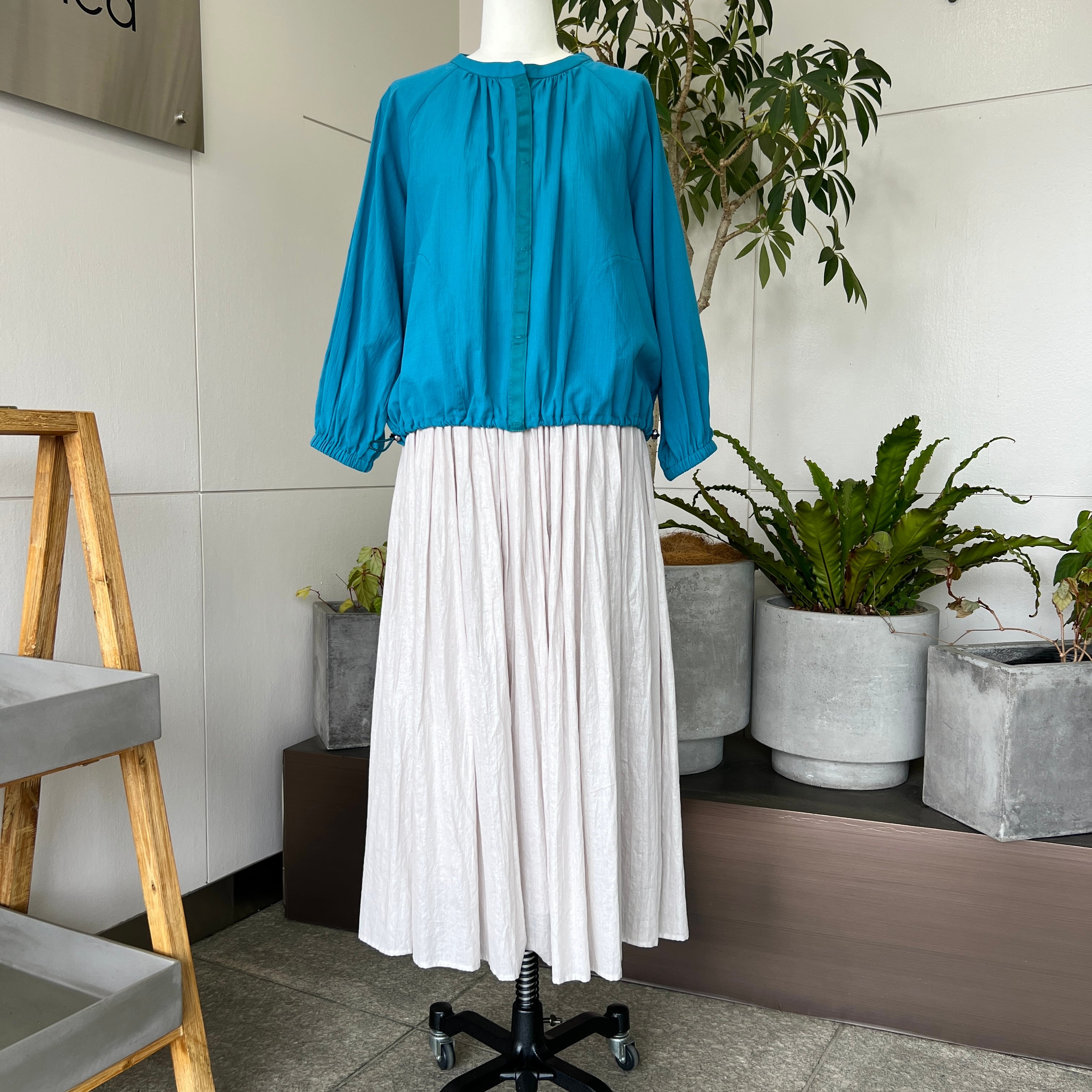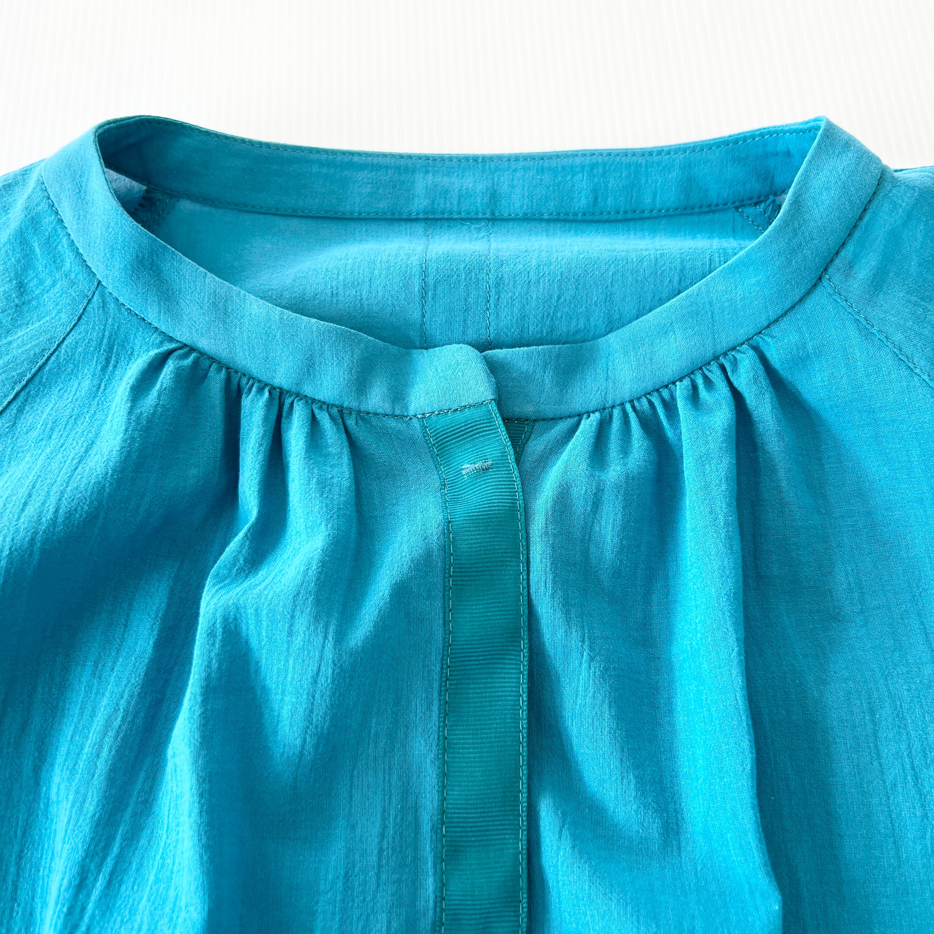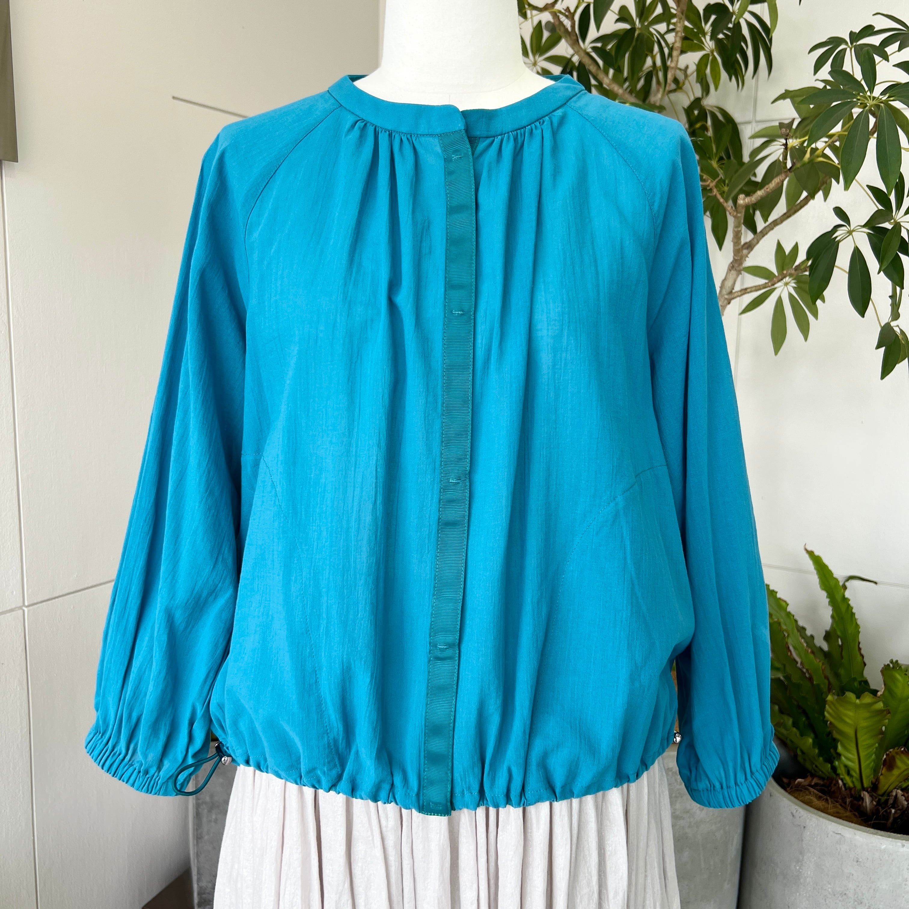 ・軽やかな素材感とターコイズブルーが目を惹くギャザーブラウスです。