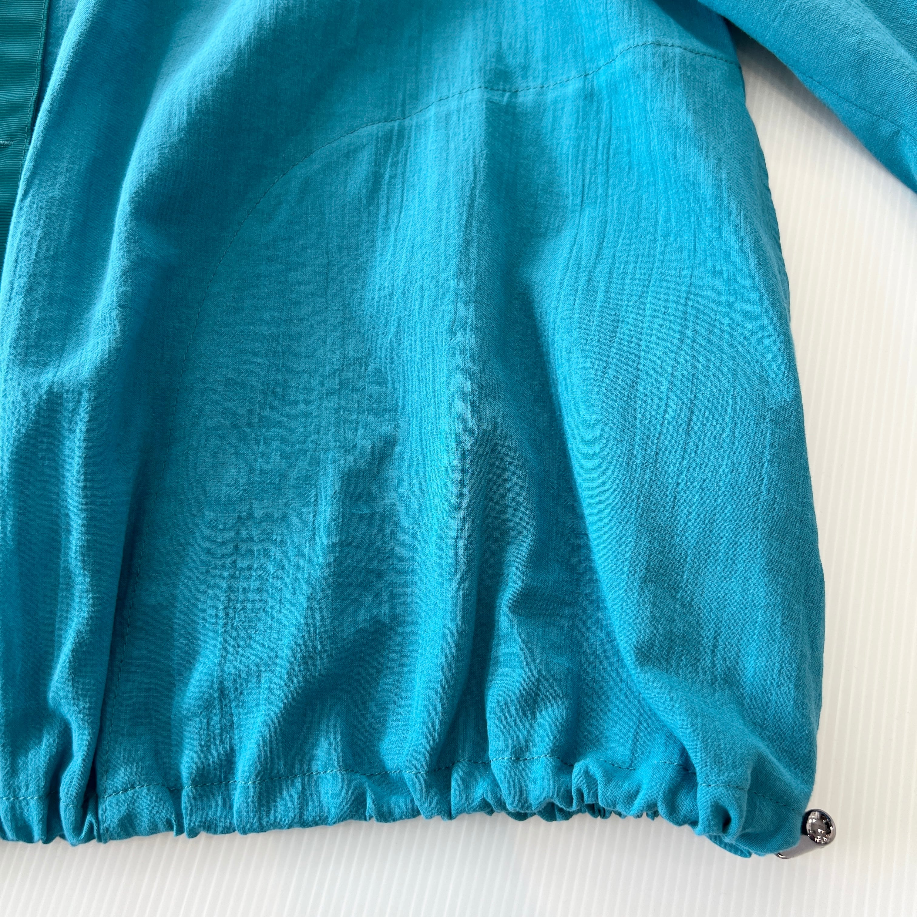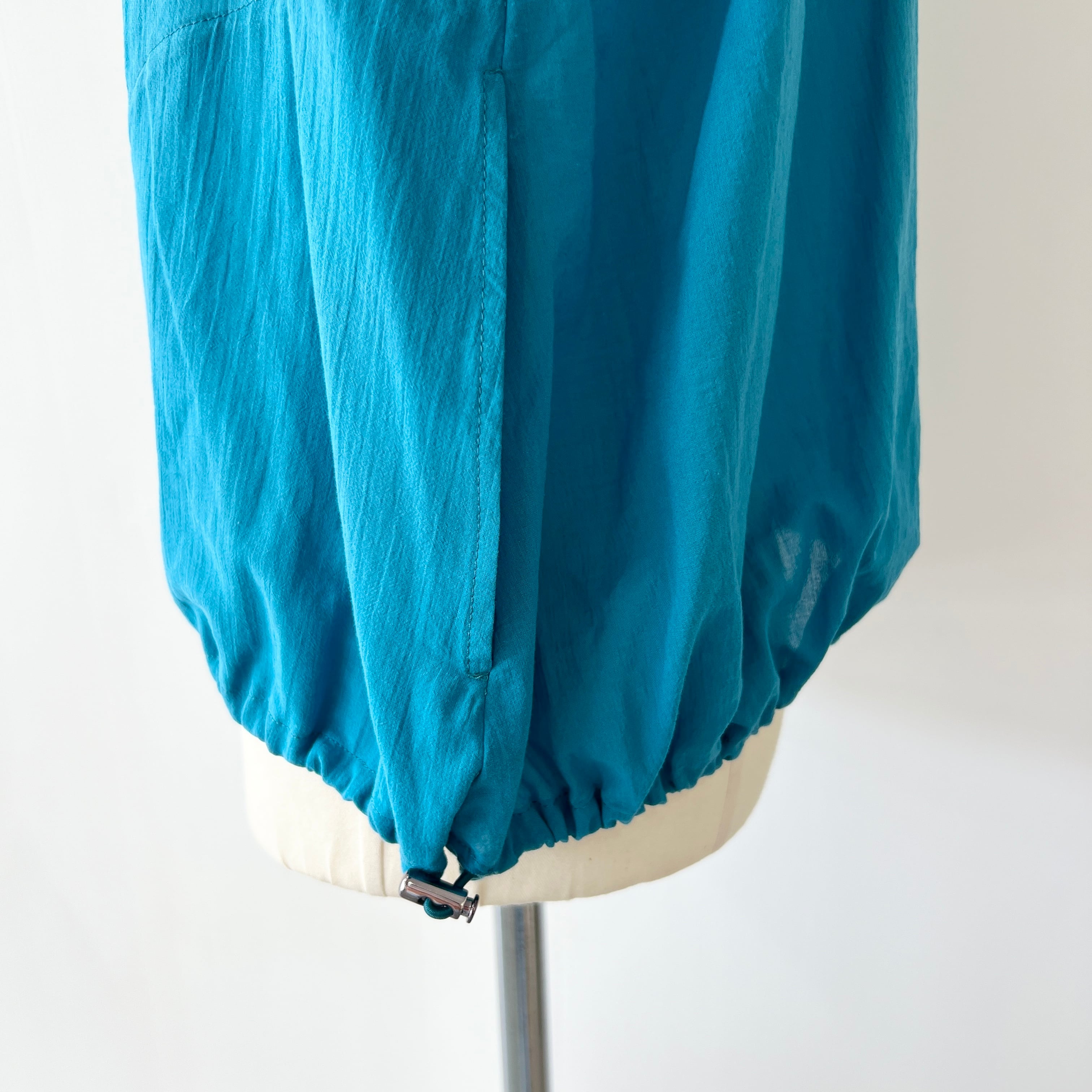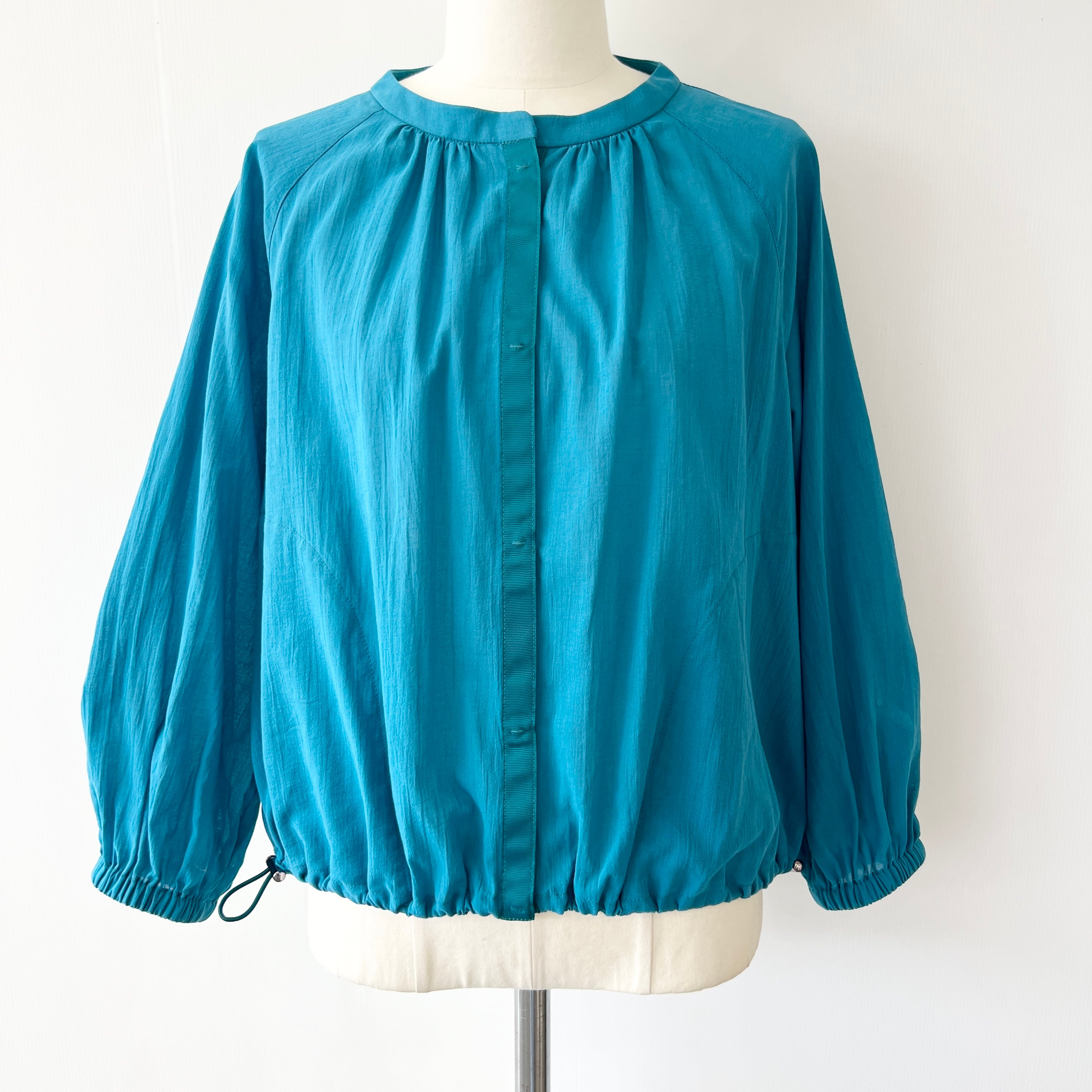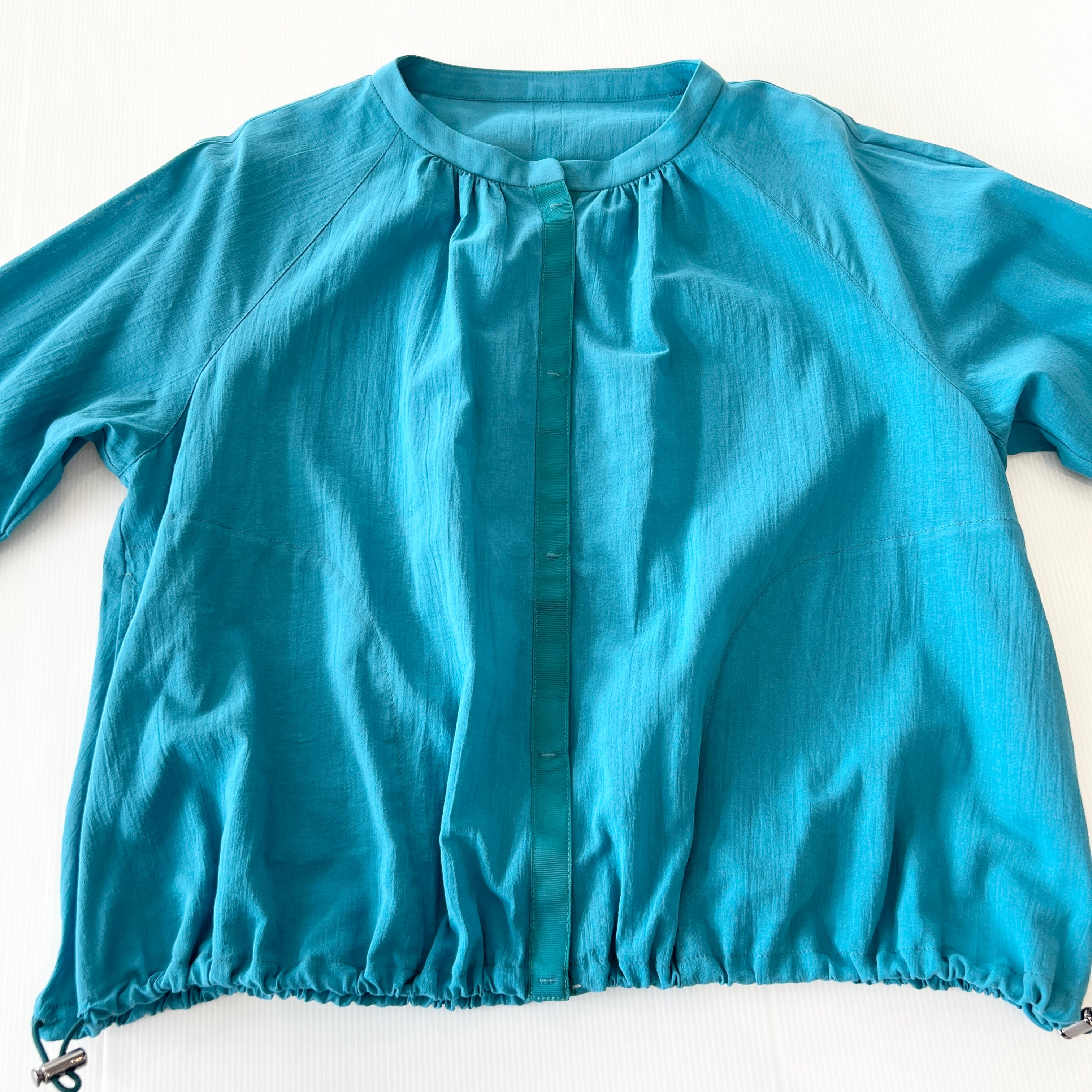 ・軽やかな素材感とターコイズブルーが目を惹くギャザーブラウスです。