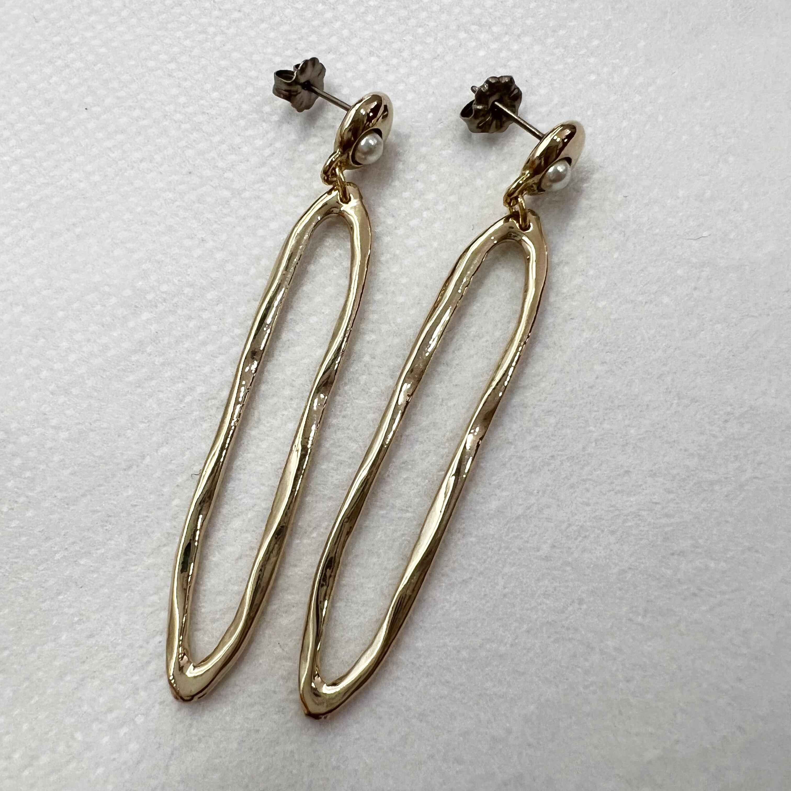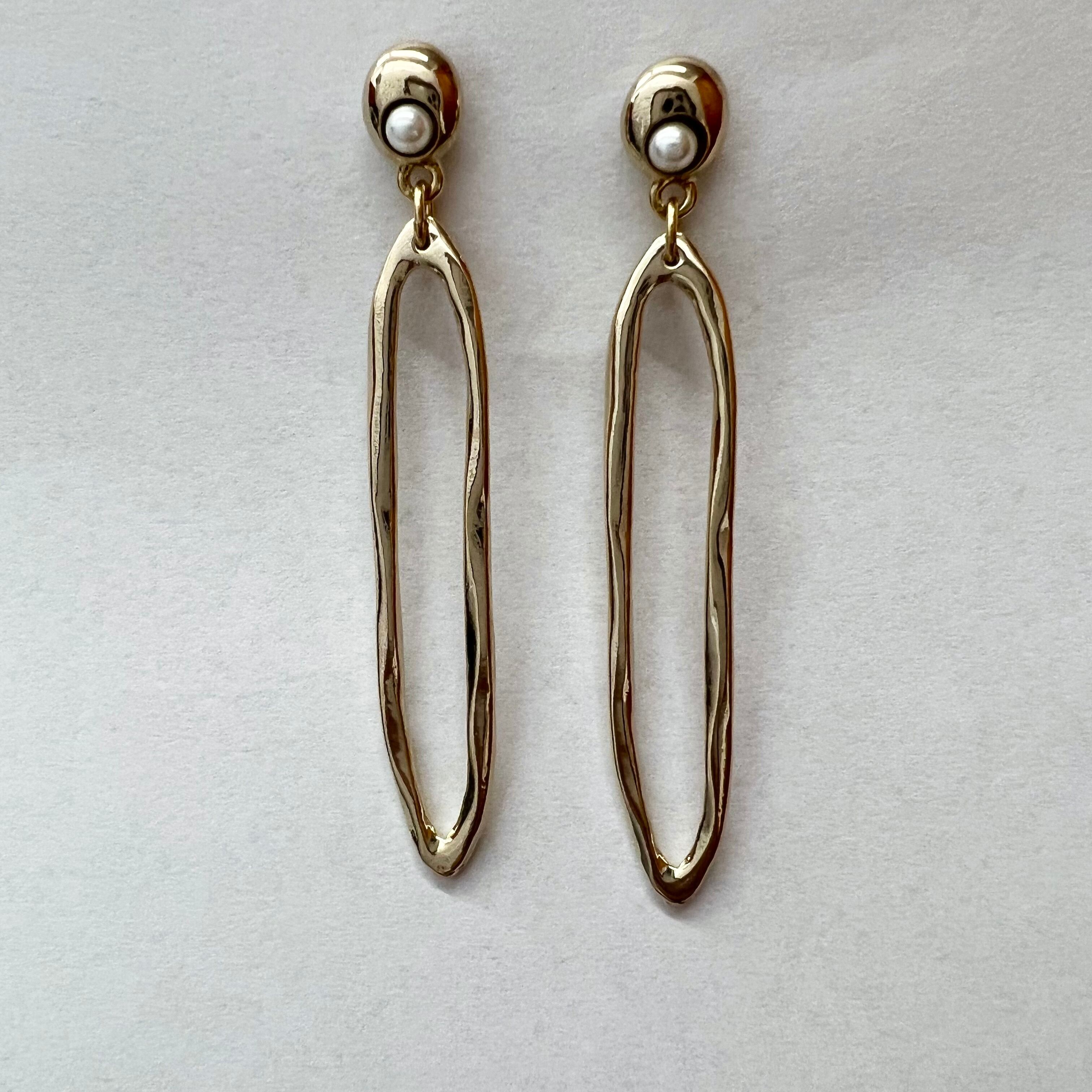 淡水パールが耳のトップに埋め込まれゴールドの変形楕円パーツがお洒落なピアスです。