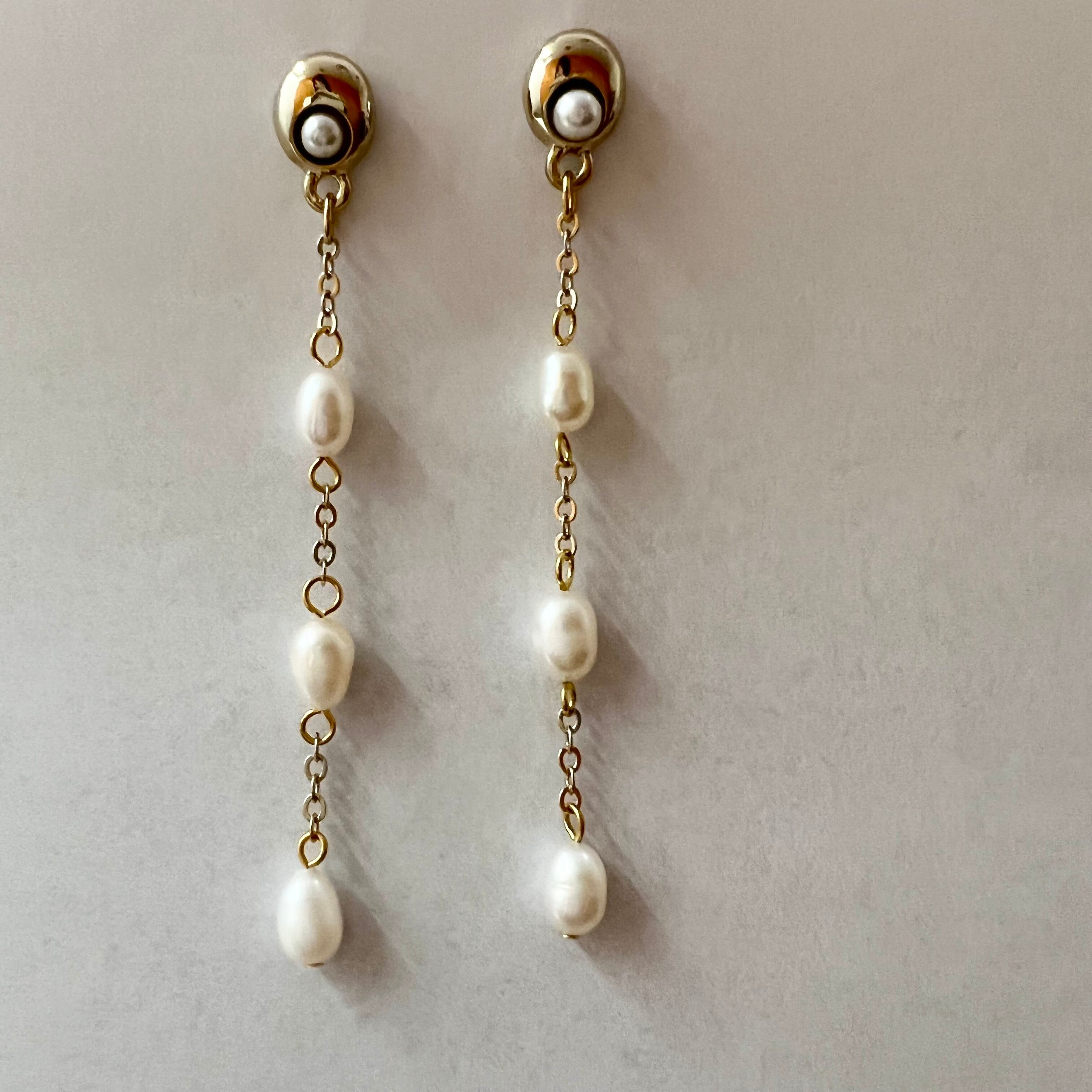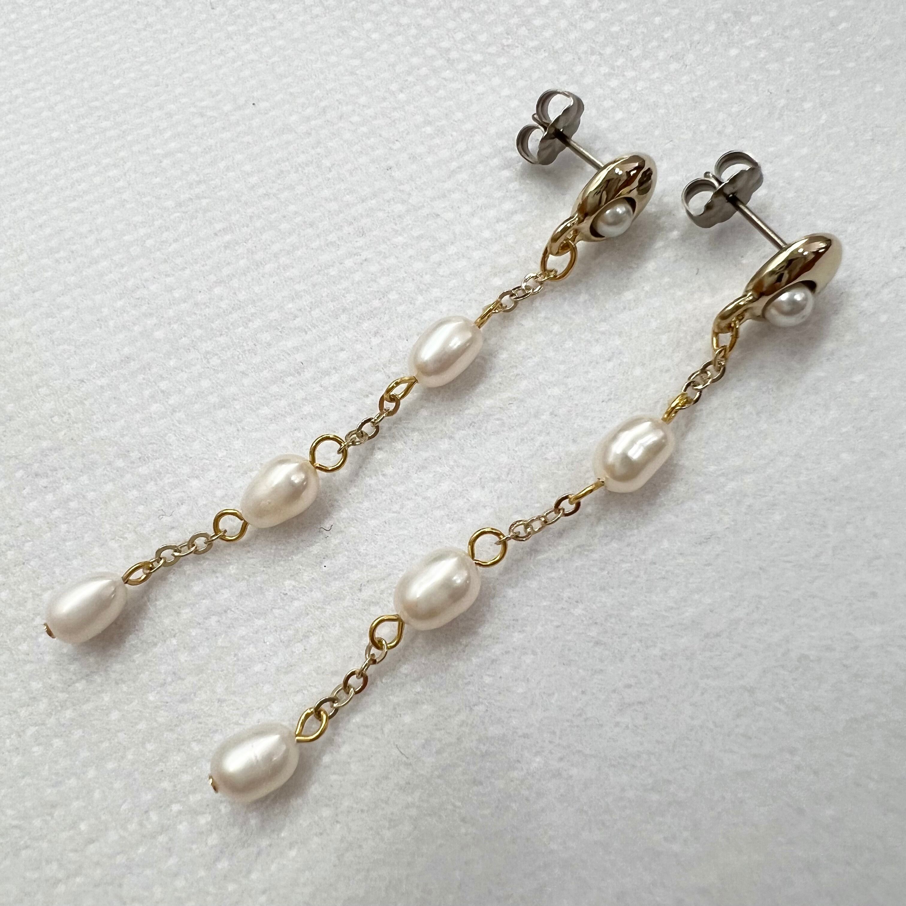 淡水パールが耳のトップに埋め込まれ 楕円淡水パールとゴールドチェーンの垂れさがるデザインがお洒落なピアスです。