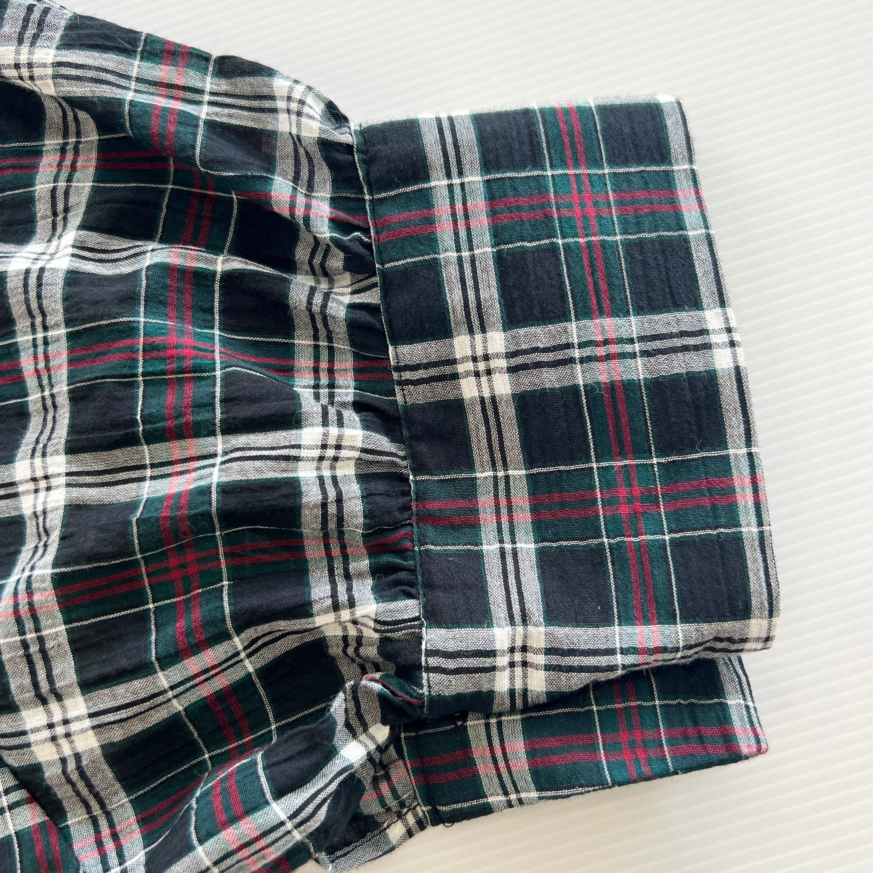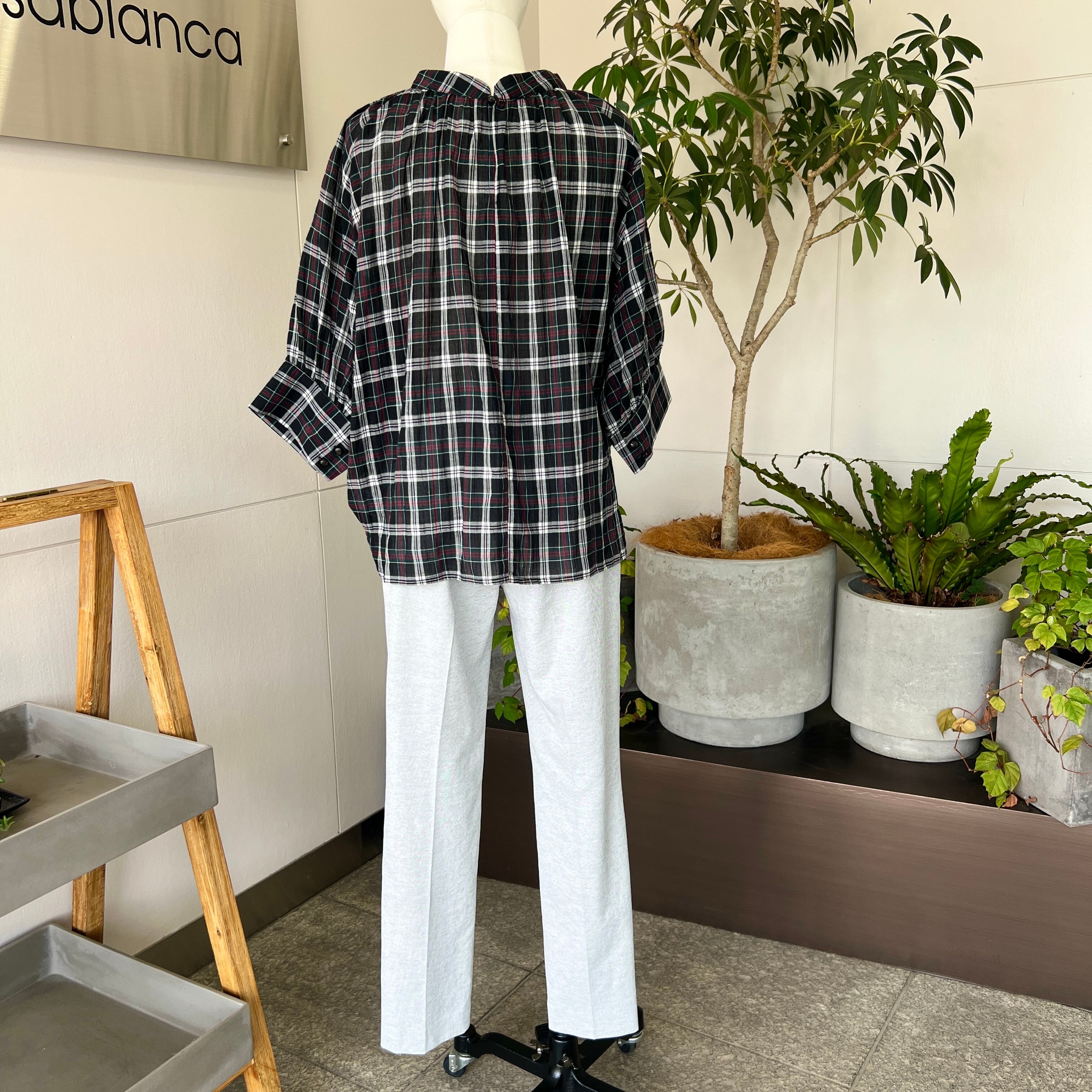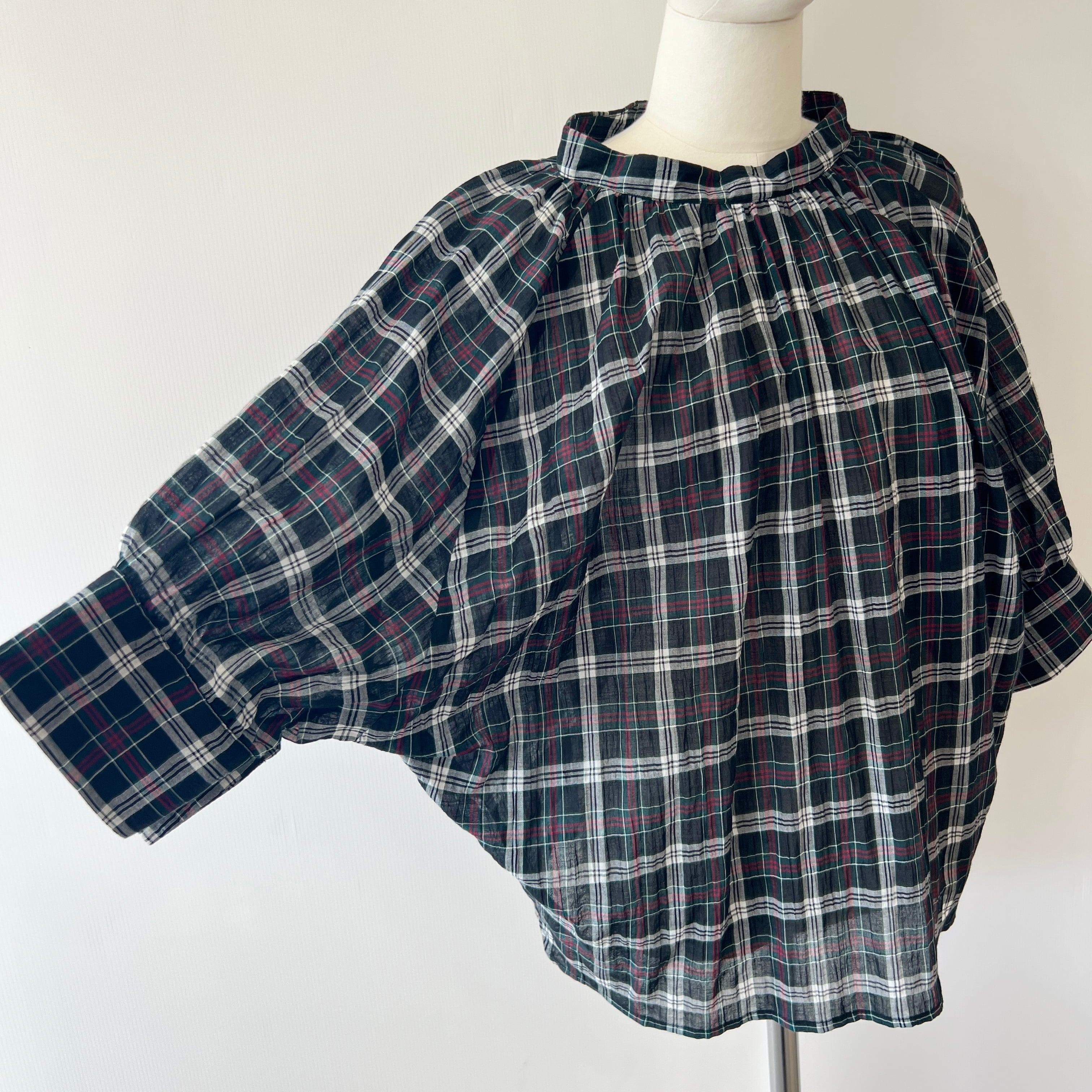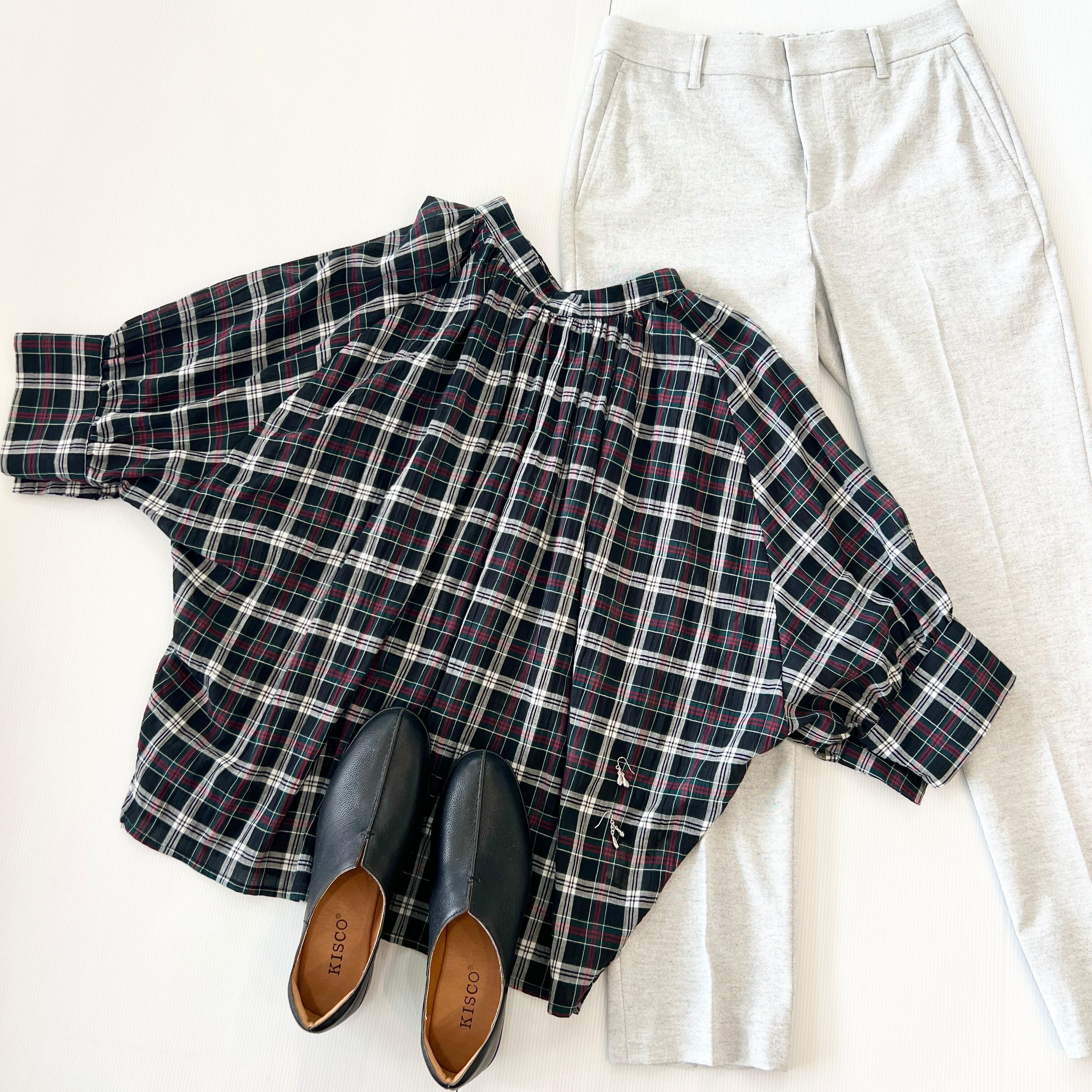 ・チェック柄のオーバーサイズの七分袖丈モックネックプルオーバーです。