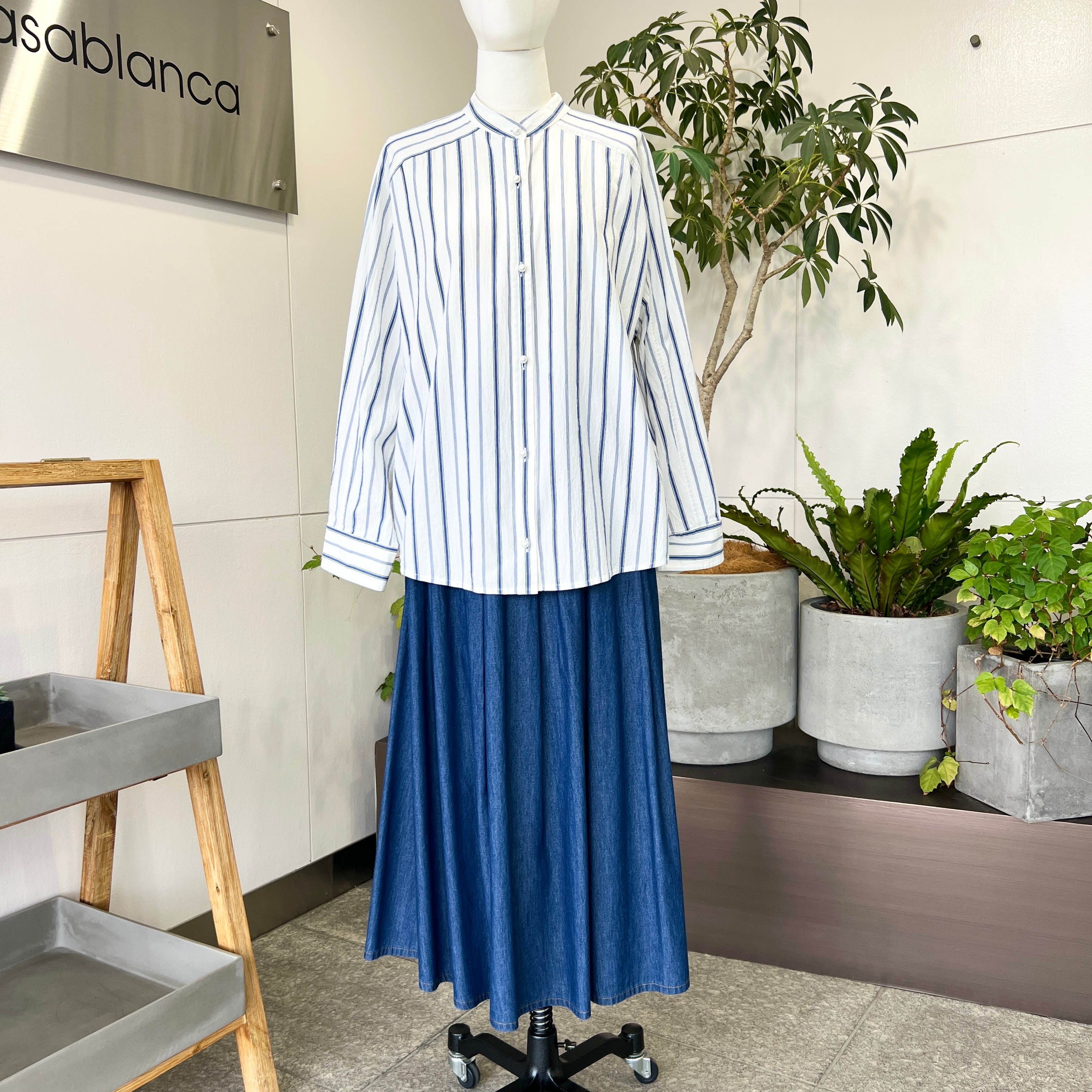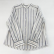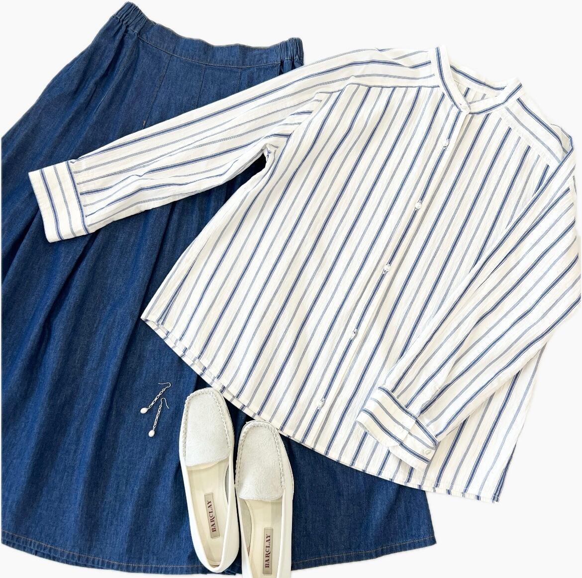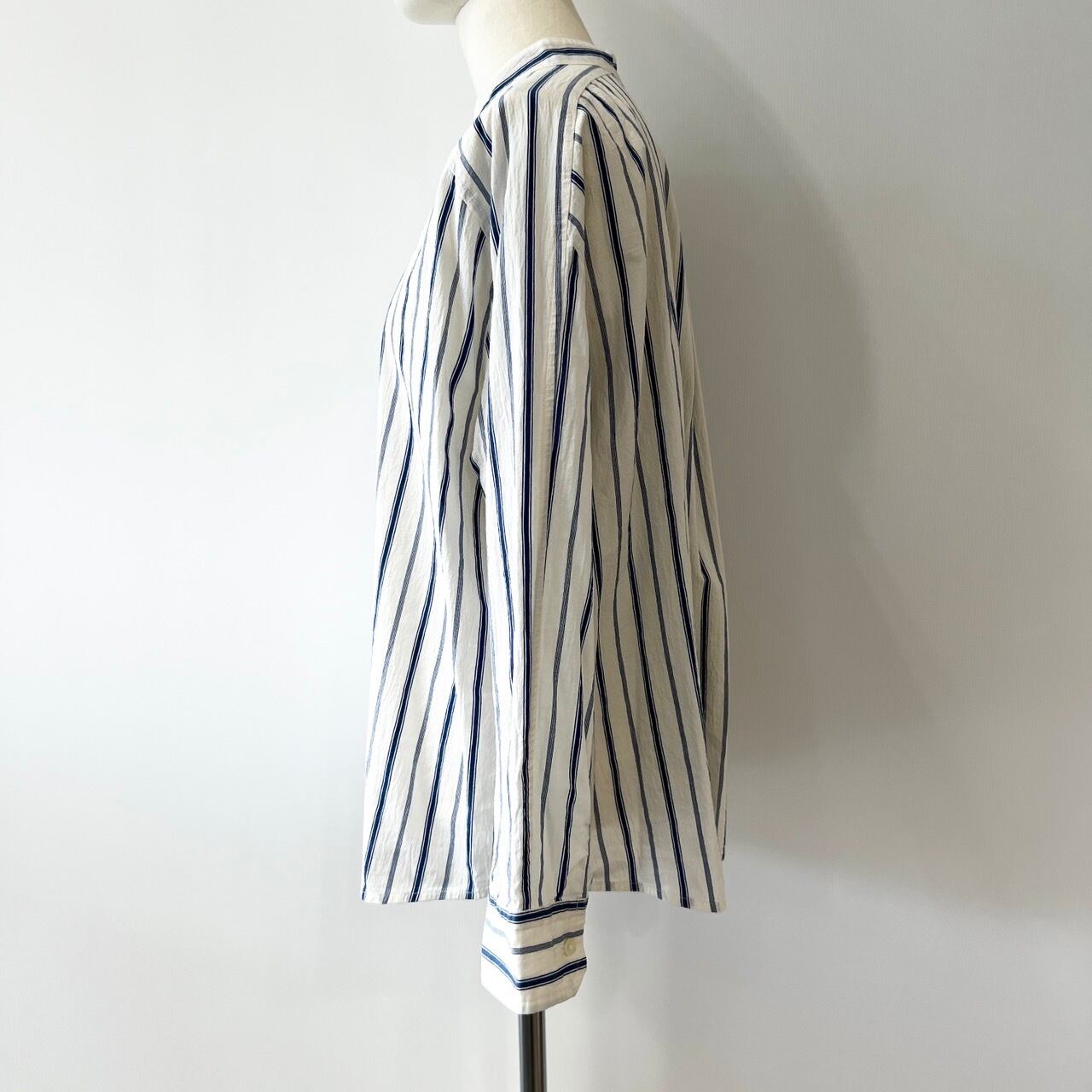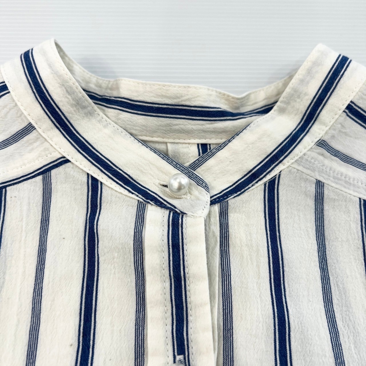 ・パールボタンがポイントのバンドカラーのストライプブラウスです。