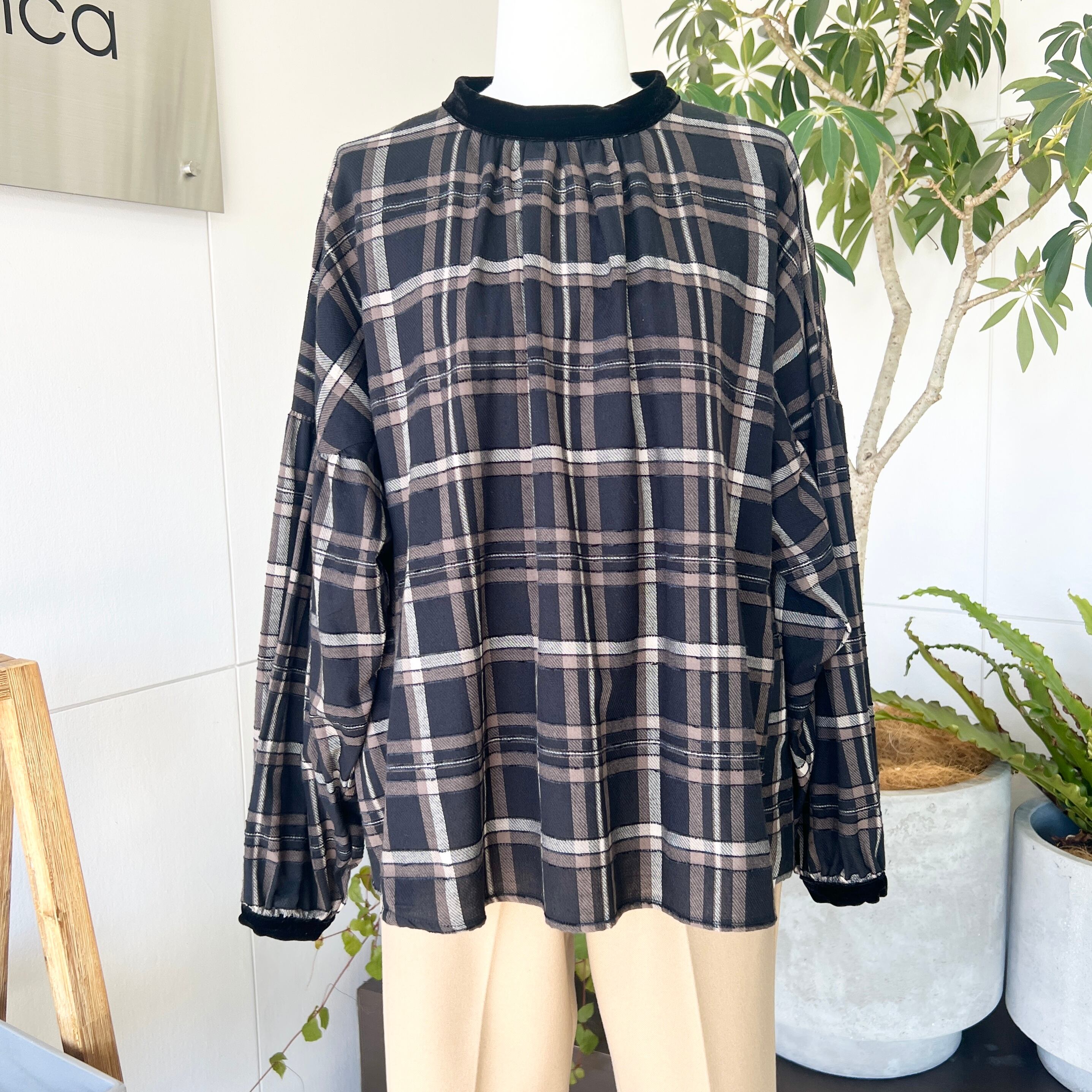 ・チェック柄のボリュームフリルスリーブがポイントのブラウスです。