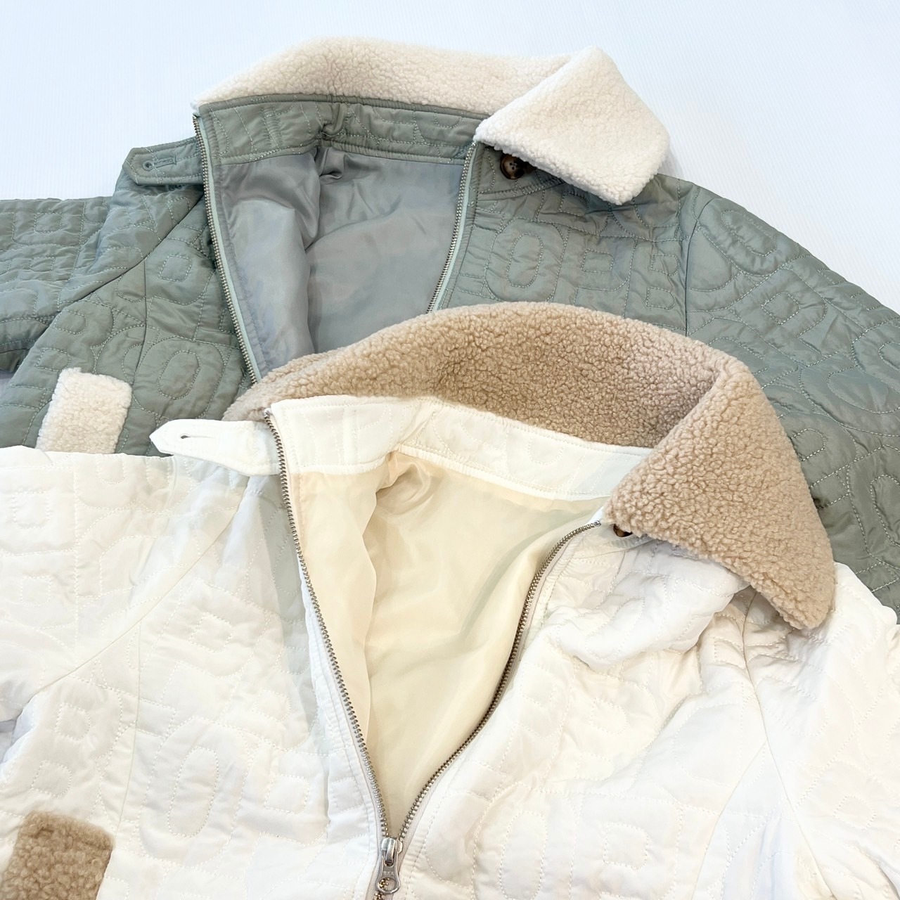 ・襟・ポケットのボアの切替とアルファベット柄のキルティングデザインがお洒落です。