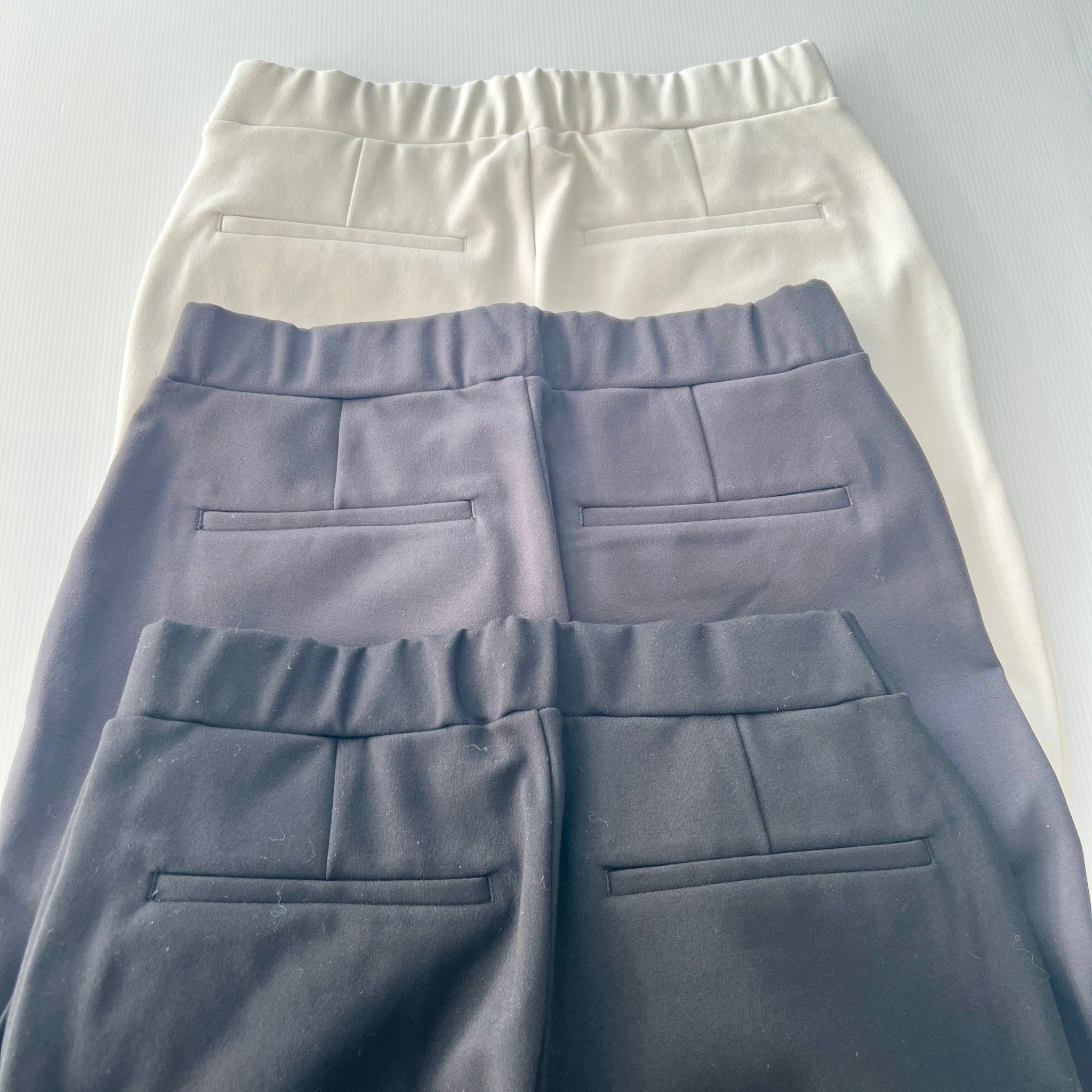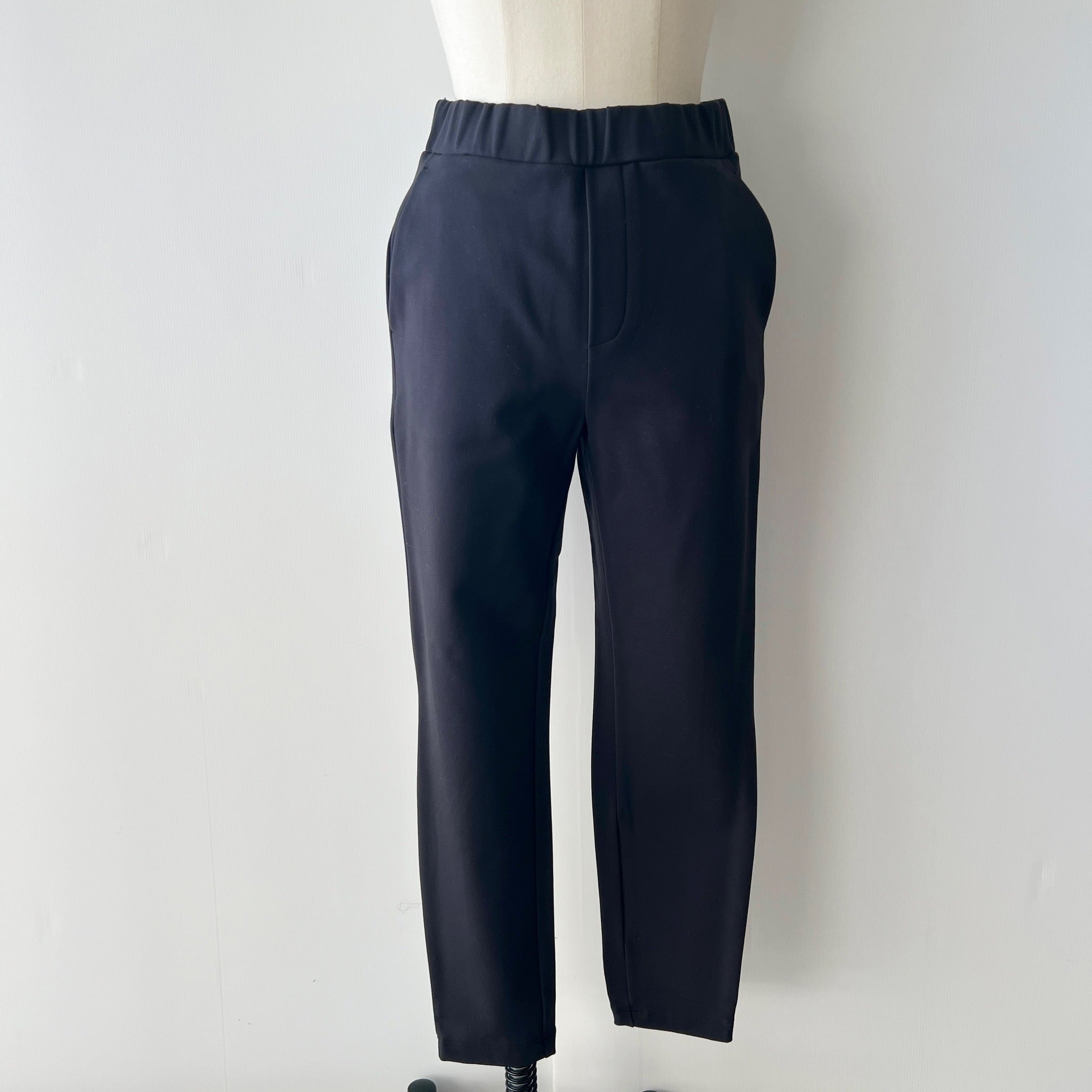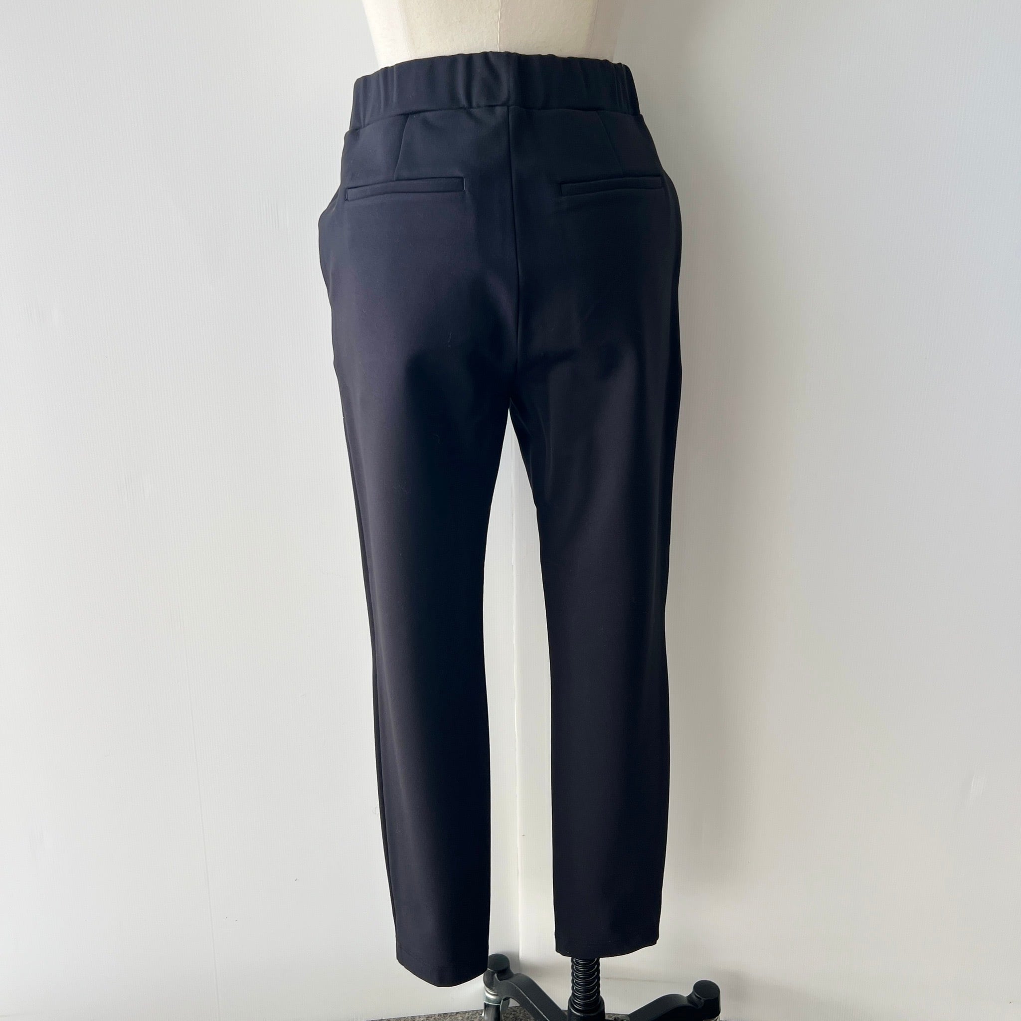 すっきりスリムシルエットながら 程よくハリのある素材でボディラインを拾いにくく 安心して着用いただけます。高いストレッチ性で動きやすく ウエストゴムでリラクシーな穿き心地。