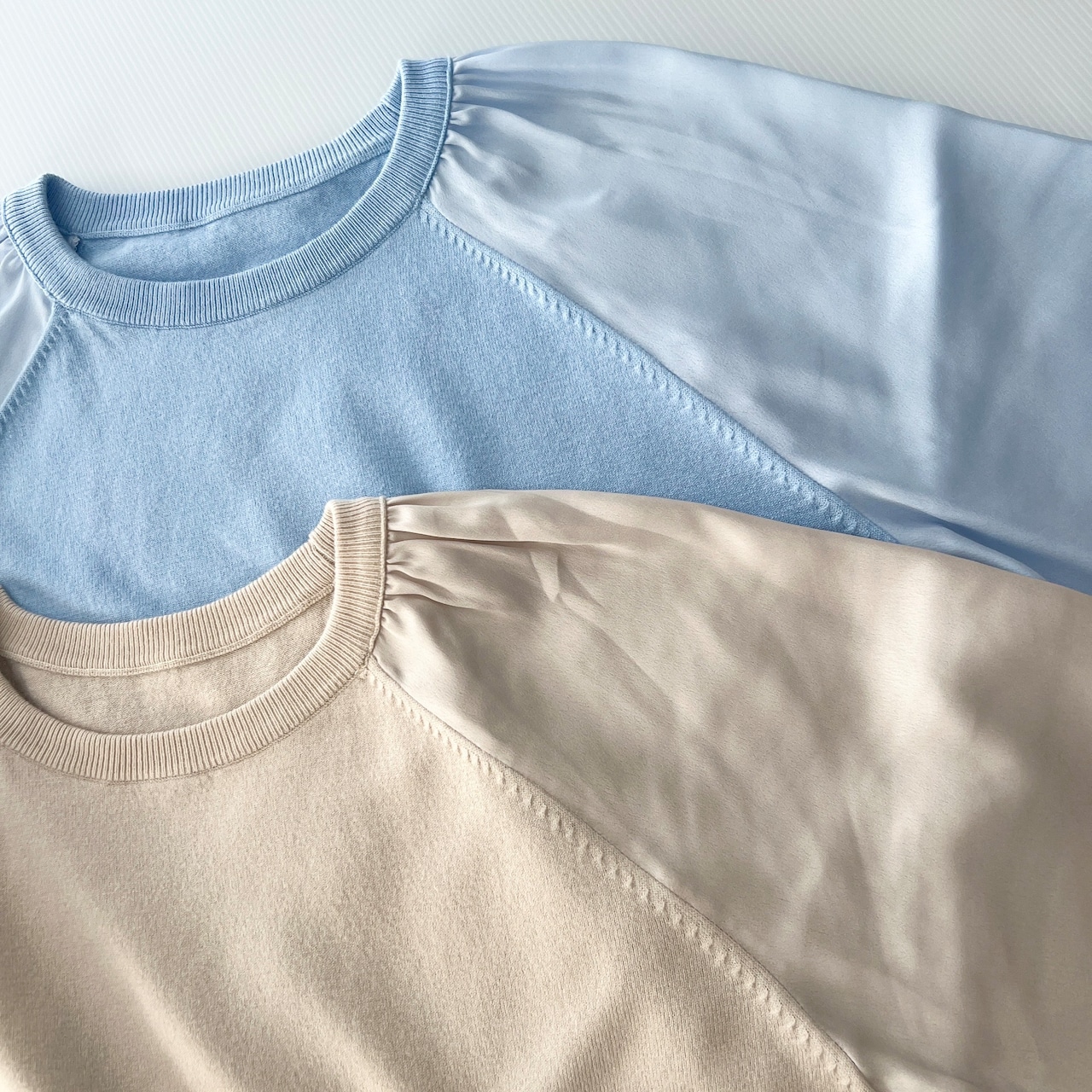 ・肌触りの優しいニット×光沢のある同色サテンのラグラン切替で上品なプルオーバーです。