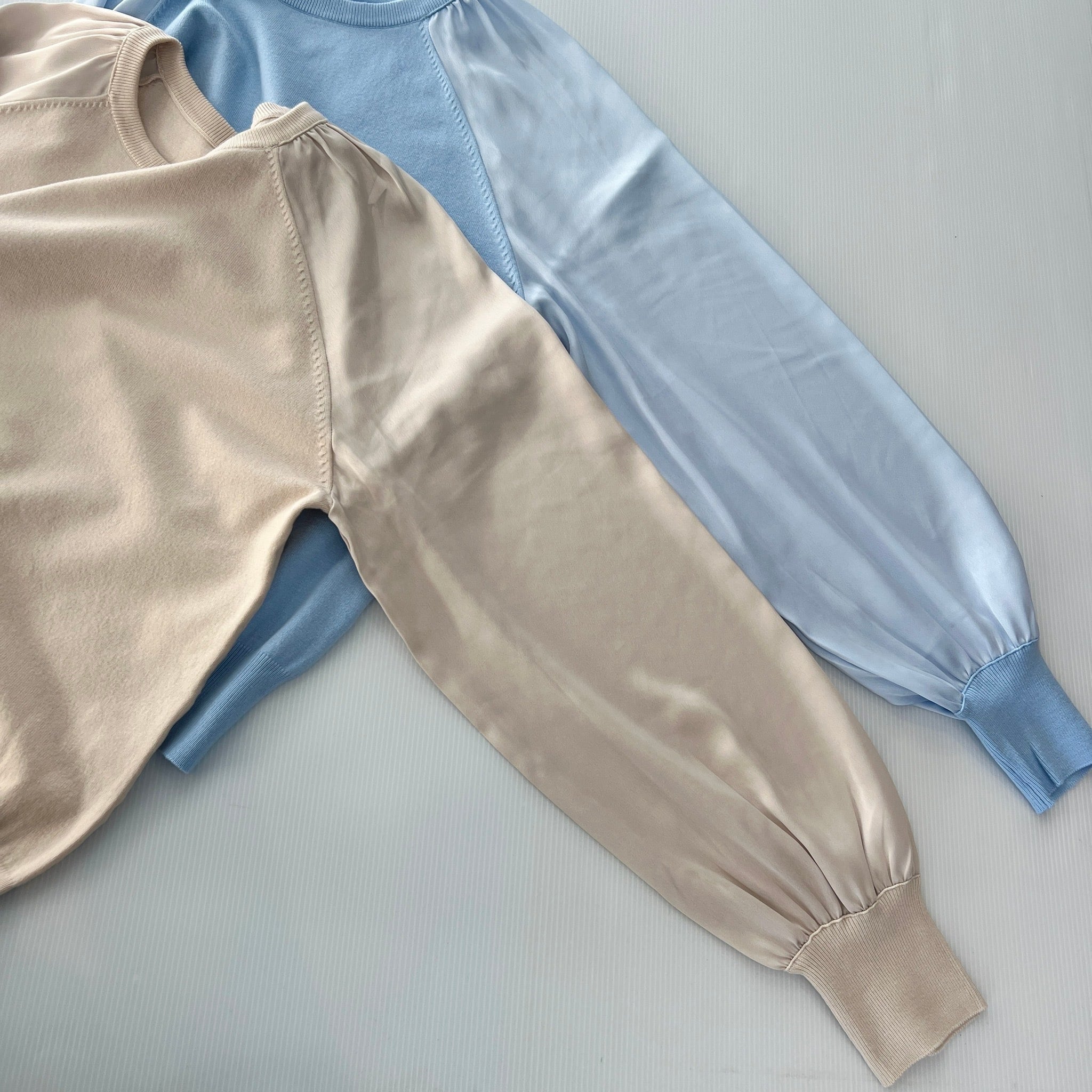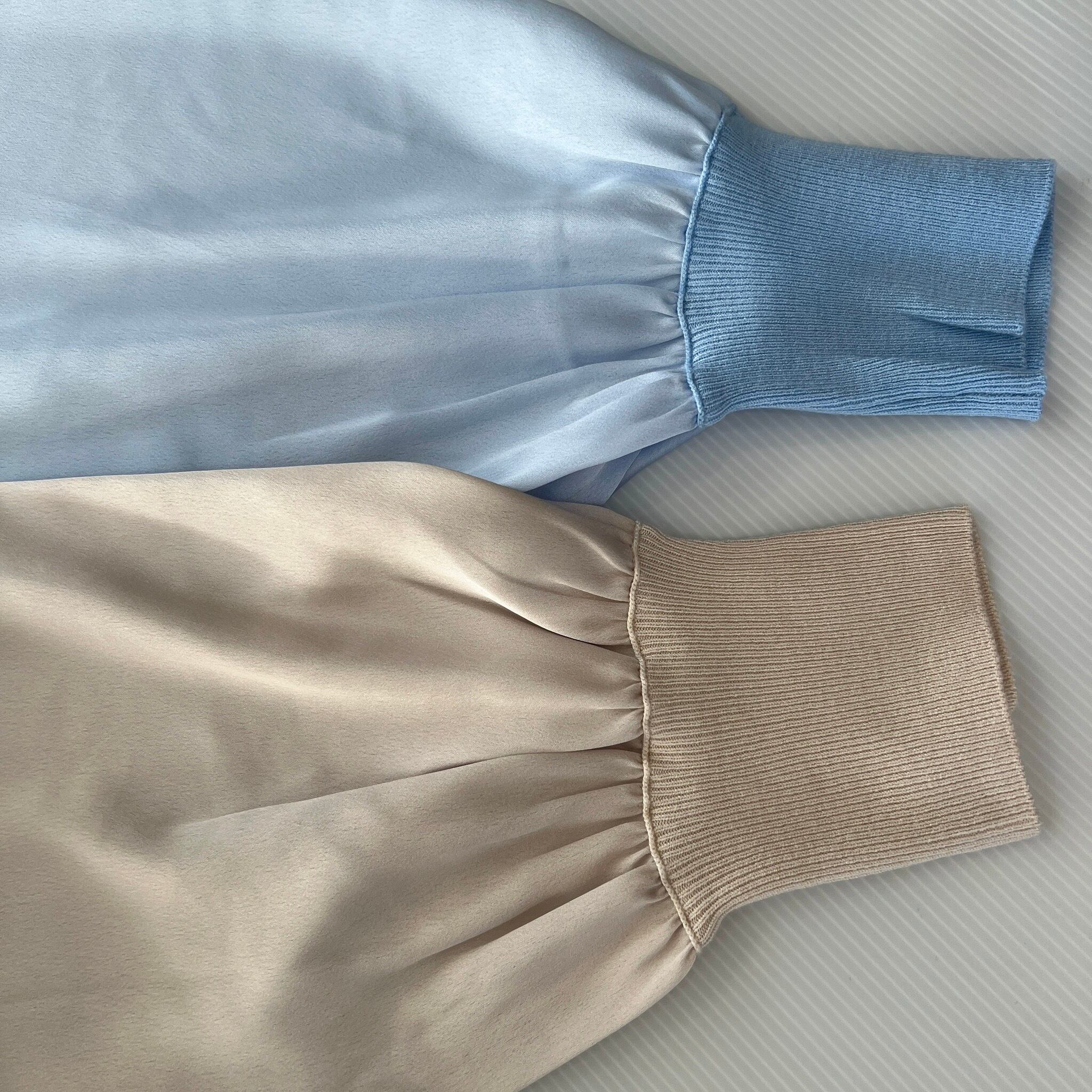 ・ニットとサテンのボリュームスリーブがお洒落なクルーネックドッキングプルオーバーです。