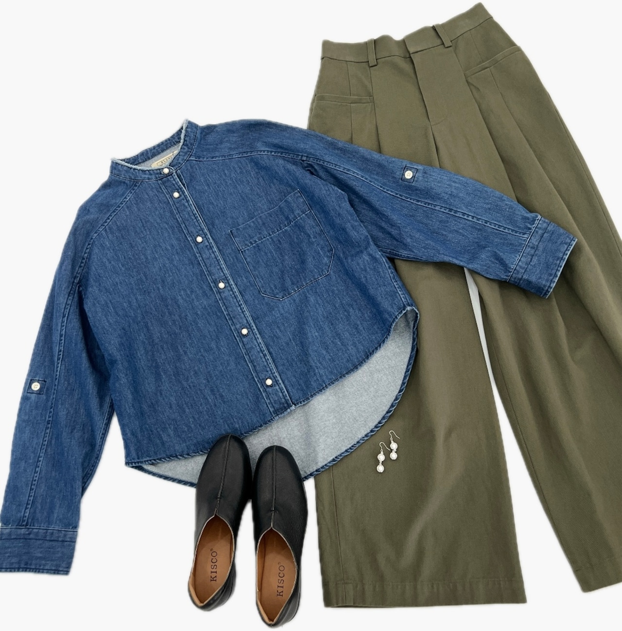 ・洗いざらしでケアが簡単なデニムと上品なパールボタンが好相性。